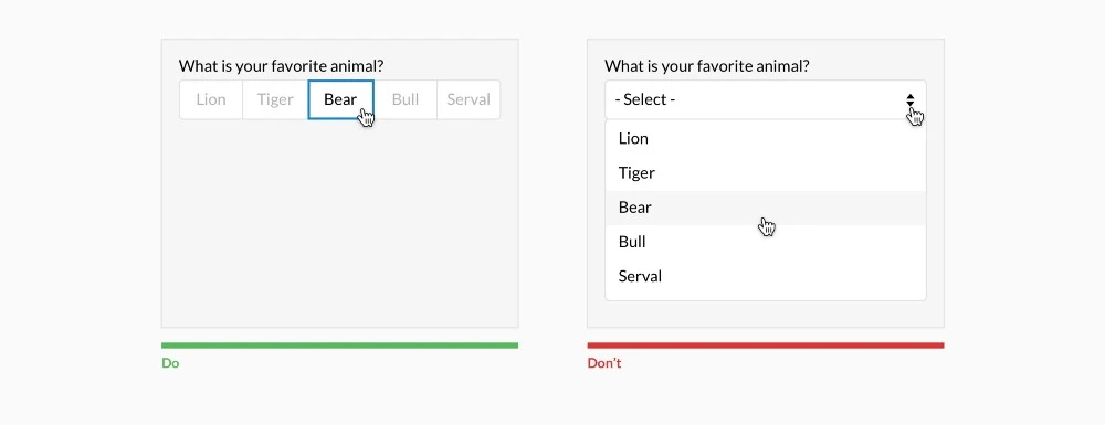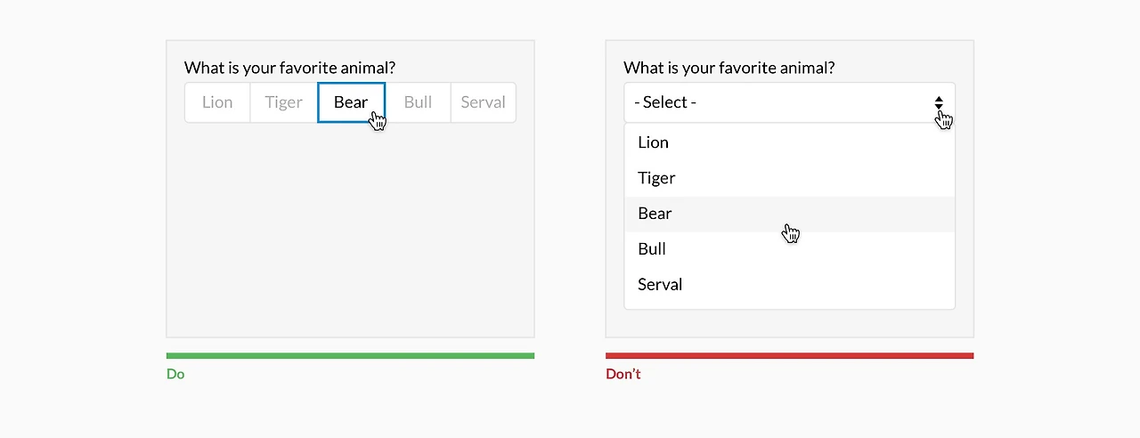 드롭다운 형식의 UI에 옵션을 넣는다면 유저는 드롭다운을 열고, 항목을 선택하기까지 두 번 클릭을 해야 합니다.