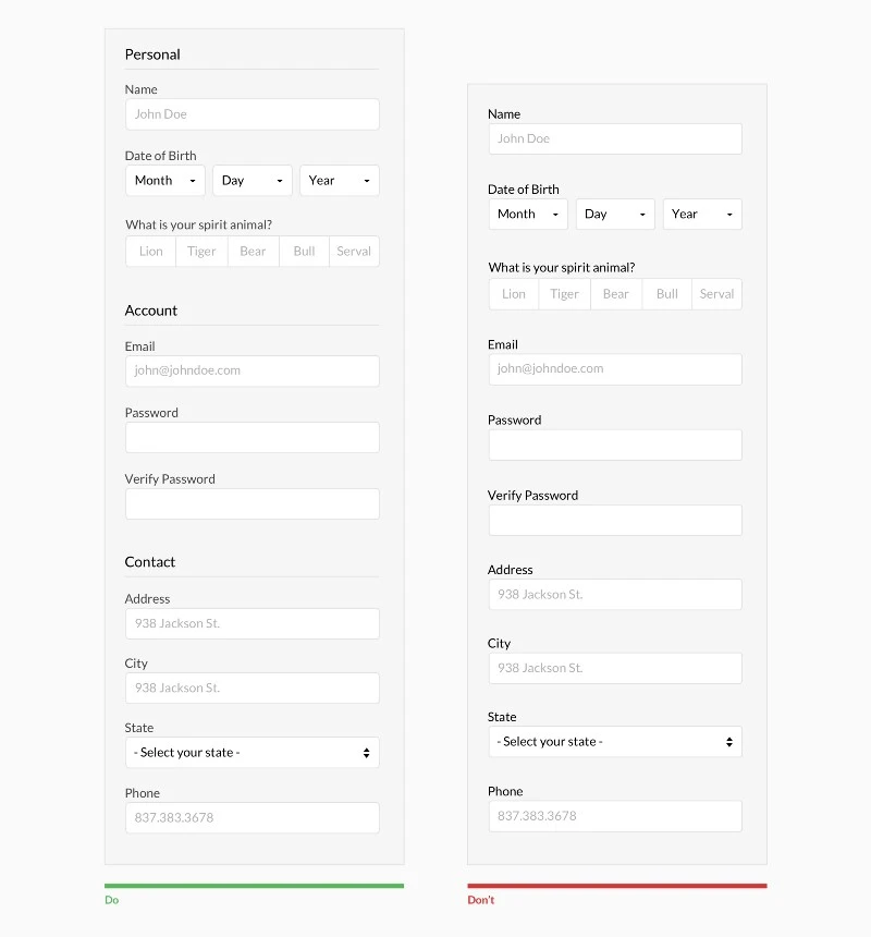 유저는 정보를 그룹화하는 사고에 익숙하고, 그룹화하지 않고 길게 단순나열해 있는 폼들에서는 쉽게 피로감을 느낍니다. 항목을 묶음으로서 유저에게 폼의 양식과 구조를 훨씬 빨리 이해시킬 수 있습니다.