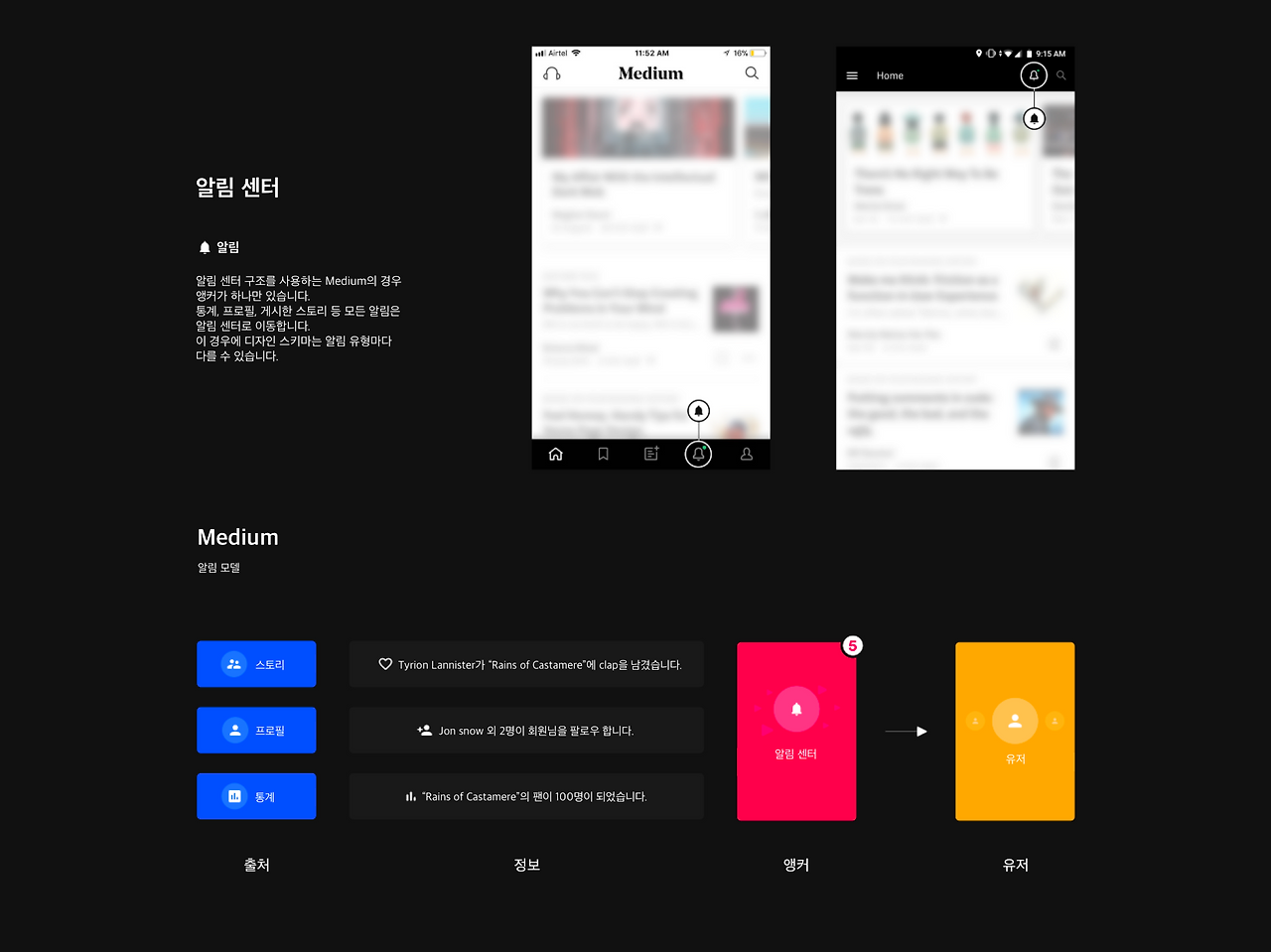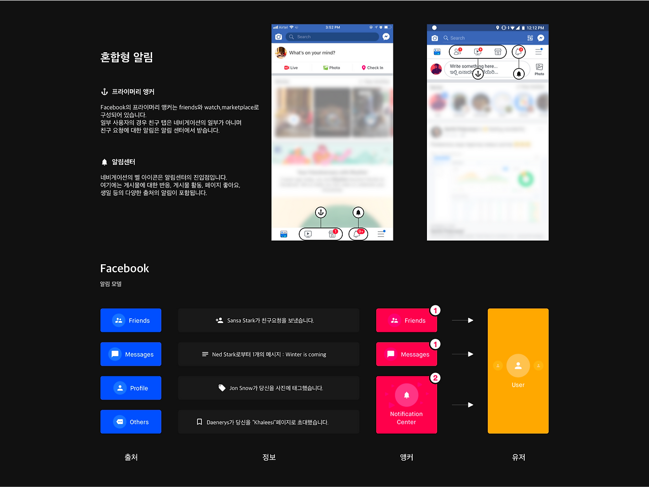 알림의 출처가 너무 다양하면 알림이 많을 때 이 모델이 약간 복잡해 보일 수 있습니다. 비슷한 유형의 알림이 있으면 그룹화하여 반복을 줄이는 게 알림의 인지에 도움이 됩니다. ( ex) "Sansa Stark 및 기타 3 명이 친구 요청을 보냈습니다.")