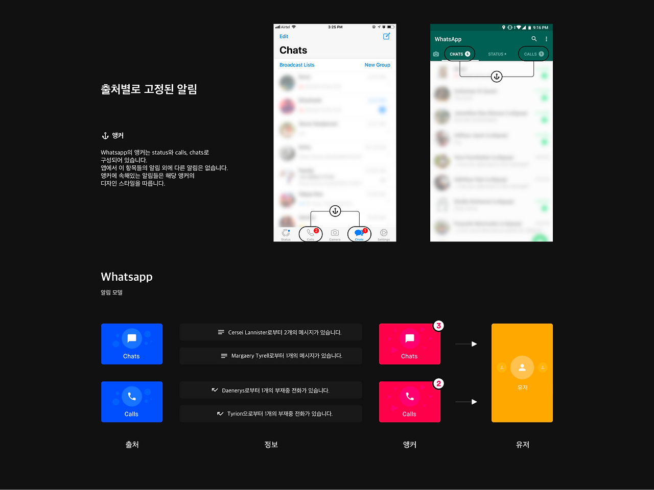 모든 앵커에는 콘텐츠에 대한 디자인 스타일이 있어야 하고 알림이 앵커의 스타일에 맞는지 확인해봐야 합니다. 이를 이해하기 위해 WhatsApp의 예를 들어 보겠습니다. 여기서 "chats"앵커에는 채팅 개체의 모양을 정의하는 디자인 스타일이 있습니다. 즉, chats에 고정된 알림은 이 스타일을 따라야 합니다. “calls”도 마찬가지입니다.