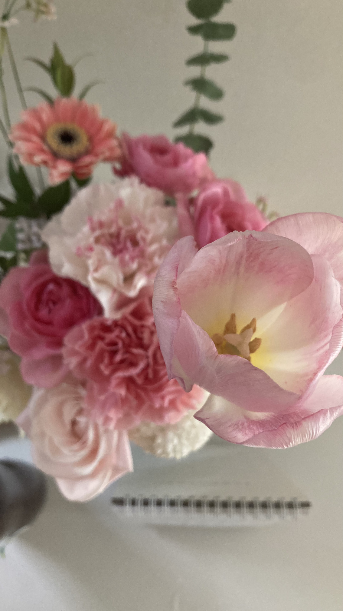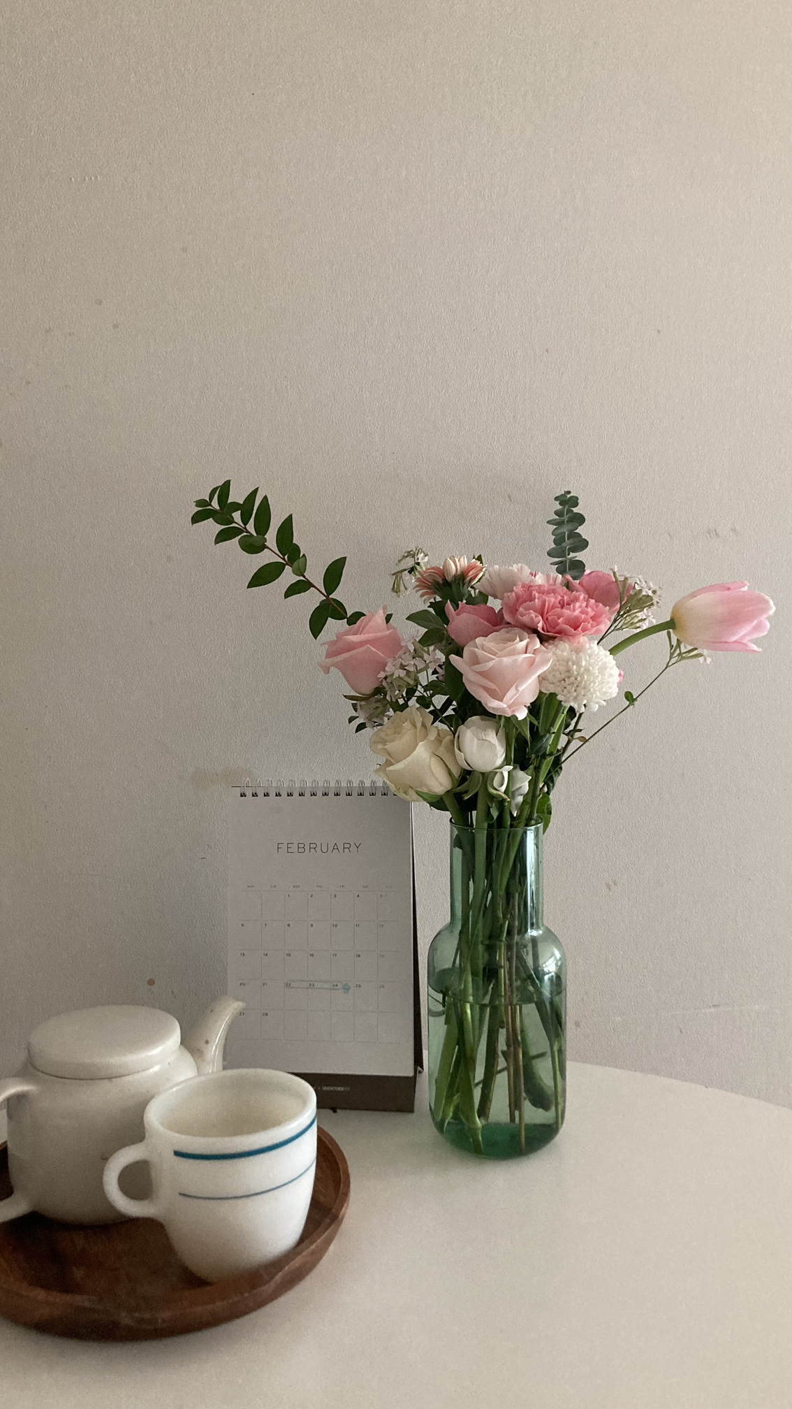 생일 다음날, 아침에 일어나 마주한 꽃이 한층 삶을 풍요롭게 한다. 핸드폰 카메라를 꺼내 이리저리 몇 컷을 찍어본다. 주변의 혼돈을 최대한 배제하고 화병과 식탁과 벽면만을 담는다. 차분하면서도 화사하다. 아름답다. 소확행이 이런 것이 아닐까. 지치고 힘든 삶 속에서 찾아내는 작고 반짝이는 행복이 이 난잡한 집안 한켠에 놓인 화병과 닮았다. 그날도 나는 소확행을 발견했고, 기록으로 남겼다. 훗날 이 사진을 보게 된다면 그날의 피로와 고단함은 휘발되고 어여쁜 한 장면만이 남아 나의 일상으로 기억될거라 믿으며. 희로애락 속에 희와 애만 선명하게 남아 삶을 지속할 용기와 환상이 유지되길 바라며.