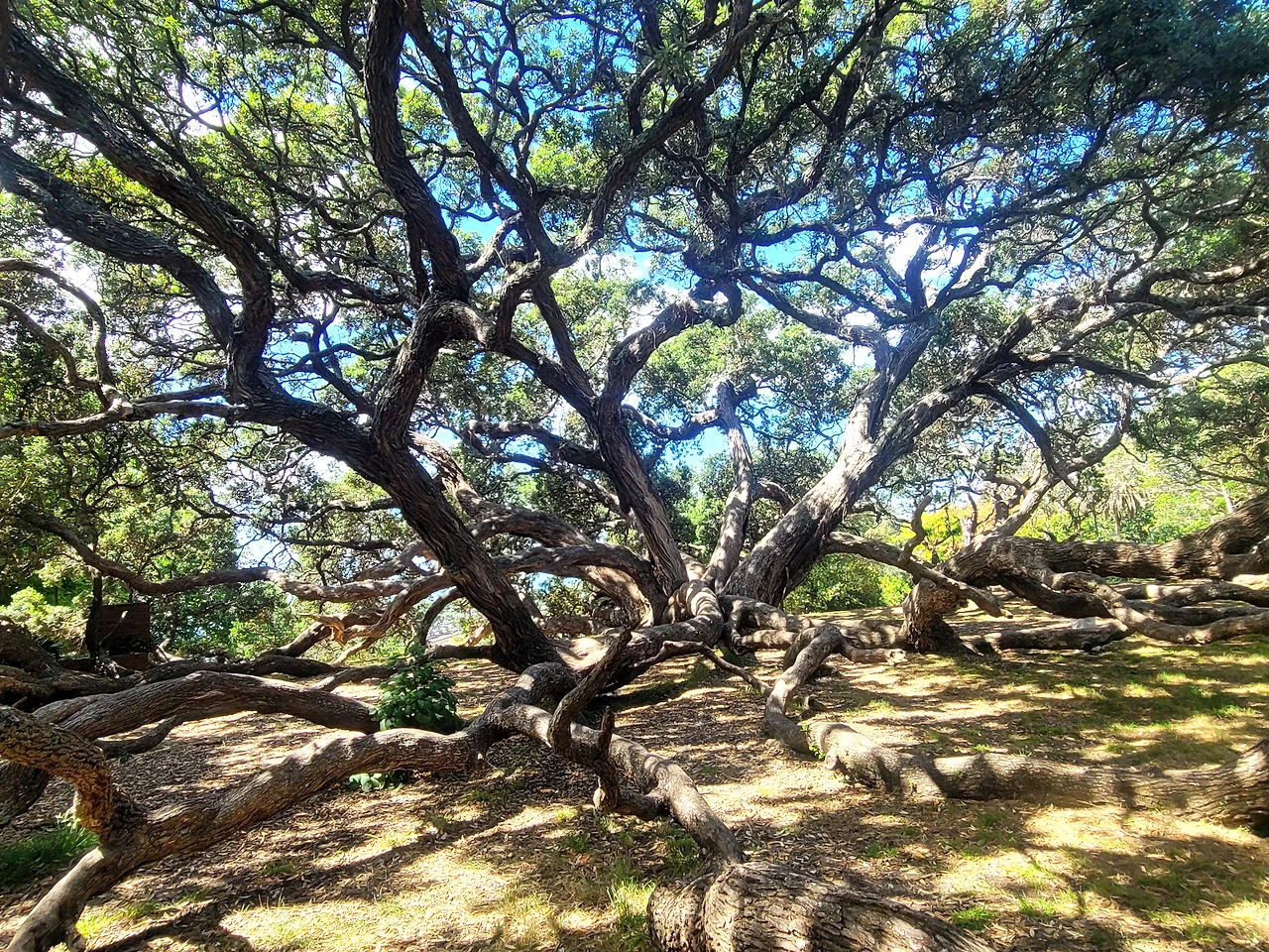 오클랜드의 도브 마이어 로빈슨 파크(Dove Myer Robinson Park)에서 만난 포후투카와 나무 앞에서 나는 한참을 서 있었다.² 공원 산책길을 걷다 마주친 이 나무는 멀리서 보면 울창한 숲처럼 보였지만, 가까이 가보니 거대한 한 그루가 사방으로 가지를 뻗어 만든 풍경이었다. 부러진 기둥이 땅에 닿은 자리에서 다시 뿌리를 내리고, 그 뿌리가 다시 줄기가 되어 하늘로 뻗어 있었다. 나무 안으로 들어가니 가지들이 얽혀 만든 아늑한 공간이 나왔다. 마오리족이 신성하게 여겨 베지 않고 그대로 두는 나무라서, 아무 방해 없이 저 하고 싶은 대로 뿌리를 뻗어온 것이리라.