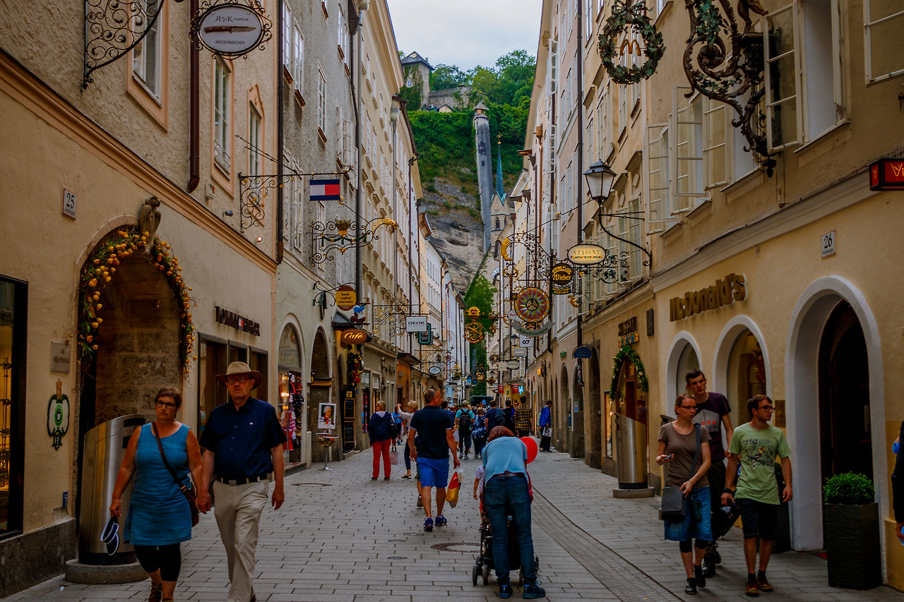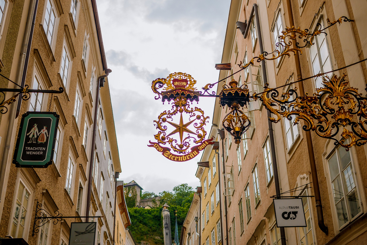 오스트리아 잘츠부르크 구시가지, 게트라이데가세(Gestraidegasse) 골목에 들어서면 눈길을 가장 먼저 붙잡는 것은 쇼윈도가 아니다. 머리 위로 길게 뻗어 나온 철제 간판들이다. 포크 모양은 레스토랑을, 황금빛 맥주잔은 펍을, 신발 한 짝은 구두방을 알린다. 정교하게 세공된 금속은 단순한 장식이 아니라, 수 세기 전부터 이어져온 길드의 언어다.
