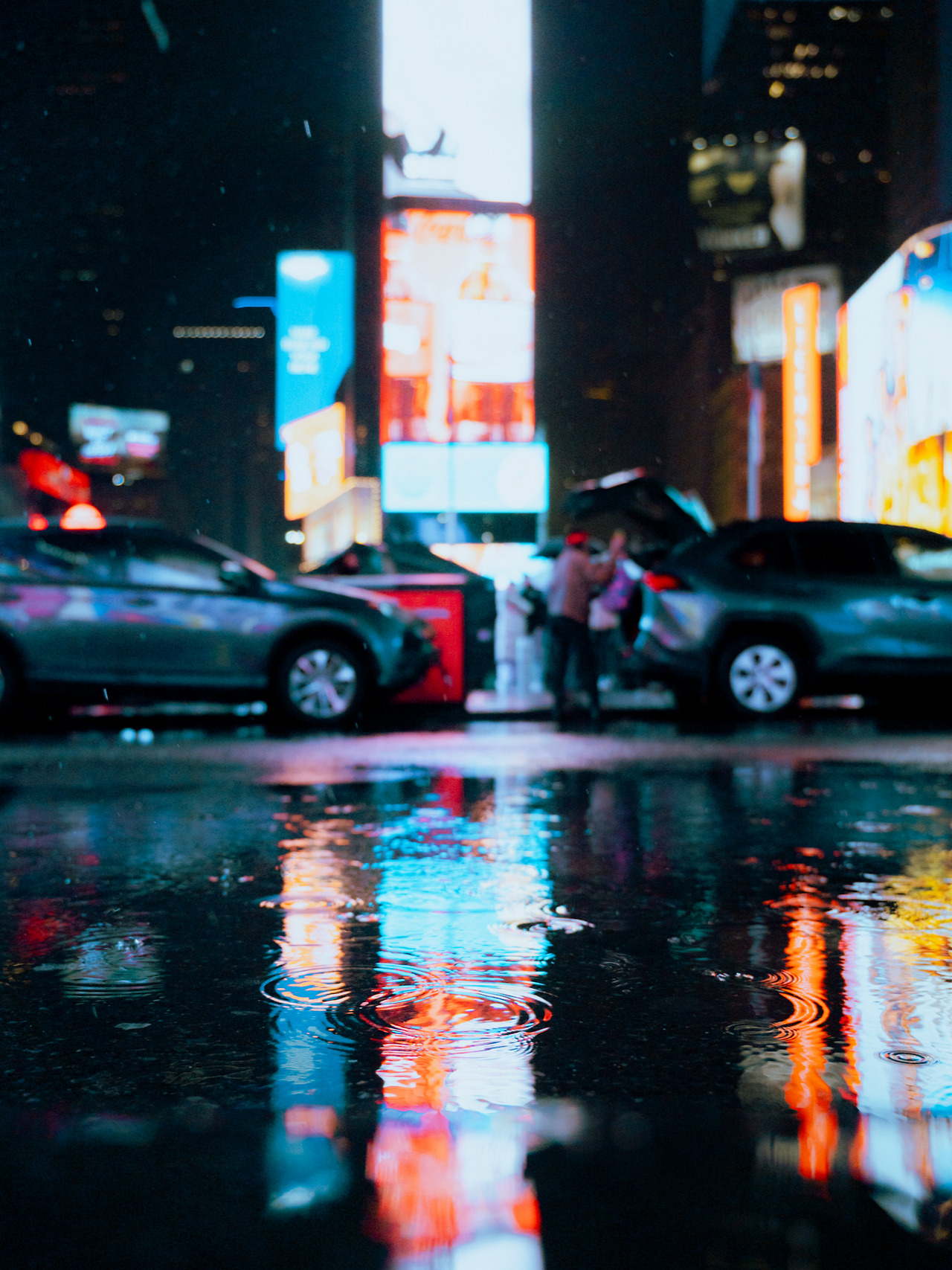 수십 미터 전광판에서 쏟아지는 빛이 그대로 젖은 아스팔트에 반사되며, 도시는 땅까지 물들이는 거대한 팔레트가 된다.