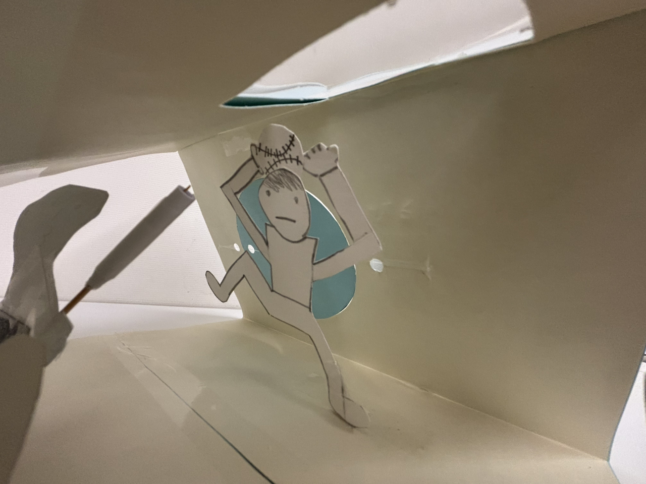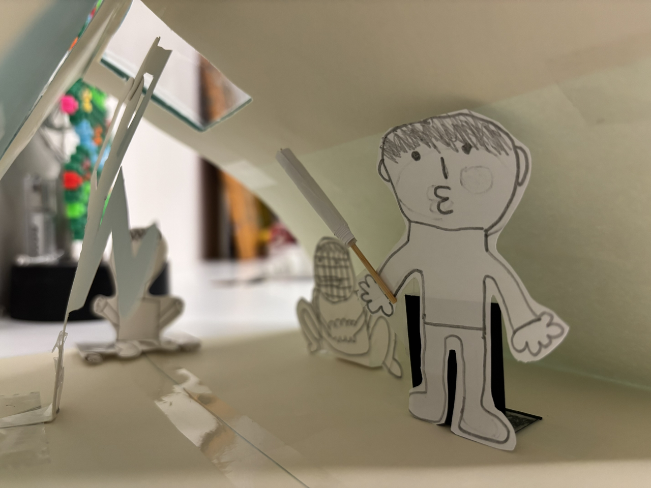 문을 뚫고 종이를 접어 공간을 만들고, 사람을 만들어 그 공간을 채웁니다.