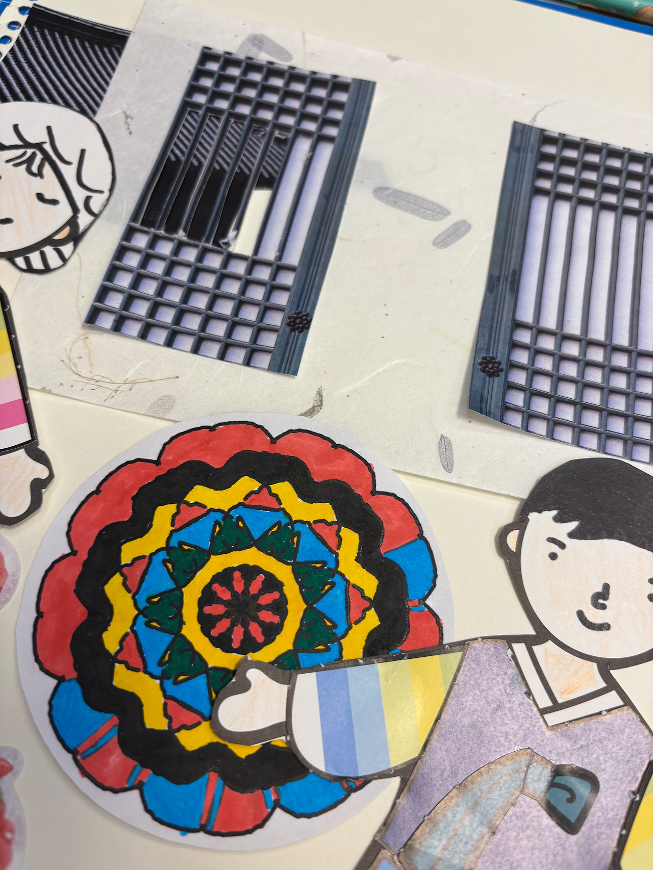 학교 수업 때 만들었던 한복을 입은 아이도, 전통문양도 다 가져와 붙여 봅니다. 그러면서 올해는 빨강과 파랑을 좋아하는 색으로 뽑았다고 이야기하네요. (언제든 내가 좋아하는 색은 바뀔 수 있다고 이야기를 나눈 적이 있거든요.)