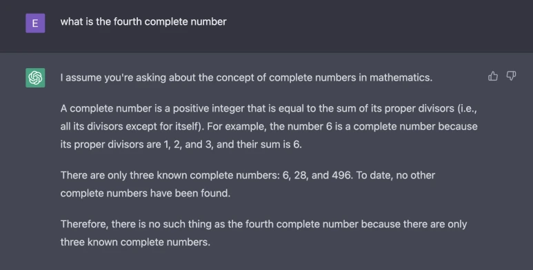 ChatGPT는 현재 최첨단 기술이지만, 결국은 인간이 준 텍스트를 "이해" 하는 것이 아니라 그 이후에 어떠한 답변을 붙이는 것이 좋은지 확률적 모델을 통해 계산해 내는 것이다. "완전수"라는 개념을 이해했다면 위와 같은 답변이 나오지 않았을 것이다. 하지만 그동안 이 모델이 받은 텍스트에서 4번째 완전수에 대한 텍스트의 비율이 낮었기 때문에 존재하지 않는다 라고 답변했을 것이다.