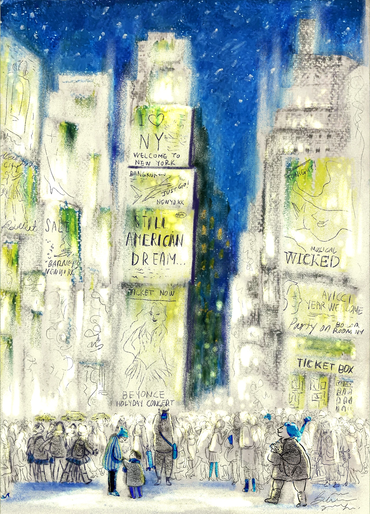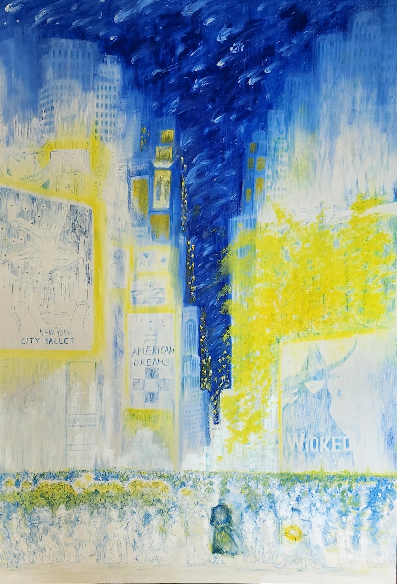 내가 그림에 담는 미래 시점은 언젠가 그것이 이뤄지길 바라며, 나의 현실이 될 거라 믿으며 채워넣는 풍경이고, 그래서 두 점의 뉴욕 그림 또한 그 마음을 터치에 하나하나 담아냈다. 올해 초 새로 그린 뉴욕 그림은 원래의 소품과 같고도 다른 면이 여러가지 있다. 전체적인 구도는 같지만 그동안 관심사와 포커스가 넓어지고 시간이 변화하면서 반영된 부분들이 많이 있는데, 그 중 중요한 것이 그림의 중앙 아래, 군중 속에서 홀로 눈에 띄는 남자의 뒷모습이다.