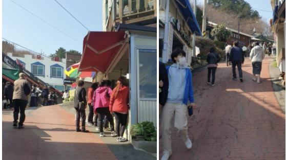 향일암의 중간에 있는 가게에서는 갓김치와 총각김치 파김치를 팔고 있었다. 그 자리에서 즉석에 버무려 만드는 것이다. 그런데 시식할 수 있도록 조금씩 접시에 담아 놓았다. 오가는 사람들에게 맛보라고 해서 맛만 보고 가는 사람이 많았다. 안 사도 좋으니 맛만 보고 가라는 말을 하면서 호객행위를 하고 있었다. 실제로 사는 사람은 별로 없고 맛만 보는 사람이 많았다. 그래도 가게 주인의 얼굴은 밝았다.