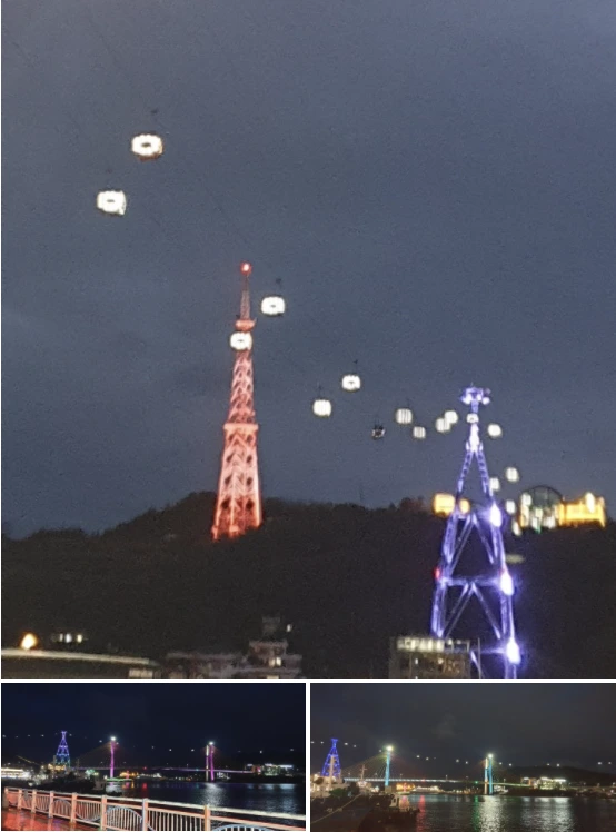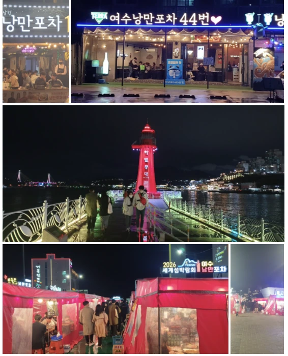 여수의 밤바다는 젊음과 낭만이 있었고 추억을 만드는 곳이다. 밤바다 야경은 환상적이다. 바다 위에는 불 켜진 선박이 떠 있고, 바다가 출렁이면서 여수대교의 조명 색깔이 바뀌는 것이 대교 위로 떠다니는 케이블카의 빛과 어울려서 환상적인 조화를 이루고 있다. 부둣가에는 낭만포차가 즐비하게 늘어서 있으면서 그 중앙 기념 촬영하는 장소에 같이 온 일행과 추억을 남기려고 사진을 찍고 있다.