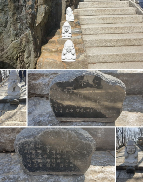그 중간에 입 막고, 귀 막고, 눈 막은 행복한 표정의 부처님 석상이 있었다. 그 밑에 쓰인 법구경의 말씀은 새겨서 생각해 볼 만한 이야기들이다.