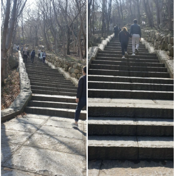 올라가는 길은 가파른 계단 길과 완만한 경사길이 있었다. 일단은 계단길을 통해서 힘들게 올라가는 쪽을 선택했다. 인생도 처음에는 힘들게 살아야 하고 그리고 나중은 편하게 사는 방법을 택해야 한다. 끝까지 계단이 힘들 수도 있지만 리듬에 맞추어서 일정한 보폭으로 올라가면 그렇게 힘들지도 않다.