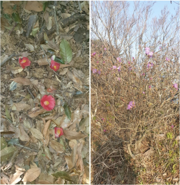 계속 올라가니까 동백꽃이 많이 피어 있었는데, 벌써 지고 있었다. 동백은 붉은 꽃이 이 섬과 잘 어울리는 꽃이다. 꽃은 마치 누가 딴 것처럼 꽃송이 채로 떨어진다. 다른 나무도 많았지만 낯에 익은 나무는 때죽나무와 소나무 정도이고 생소한 나무가 너무 많았다. 다른 곳에 없는 나무나 식물이 많다고 들었는데 실제로 실감했다. 그래도 가다가 보니까 아직은 추워서 피지 않은 진달래가 이곳에서는 피고 있었다.