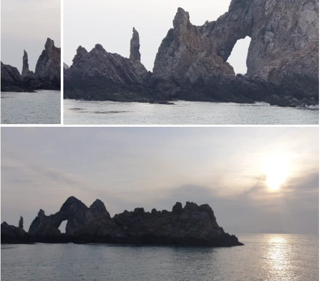 유람선은 홍도에서 최상의 풍경이 나오는 곳과 방향을 알고 운행하지만, 그래도 이곳은 움직일 때마다 새로운 모습이고, 바다 위에 솟은 바위는 갖가지 모양을 하고 있었다. 가장 사진이 잘 나오는 두 곳에는 유람선에서 탑승한 전원에게 촬영해 주었다. 유람선 비용이 상당하니까 그렇게 하는 것이라고 하지만 그래도 전문적으로 사진을 찍어 주니까 잘 찍었다. 좋은 배경에서 자리를 선점해서 오랫동안 찍었으니까 훌륭한 사진이 많이 나왔을 것이다. 홍도는 처음에 시작할 때에 가장 아름다운 풍광이 나오고, 가면서도 계속 여러 가지 모양을 한 기암괴석이 많았다.