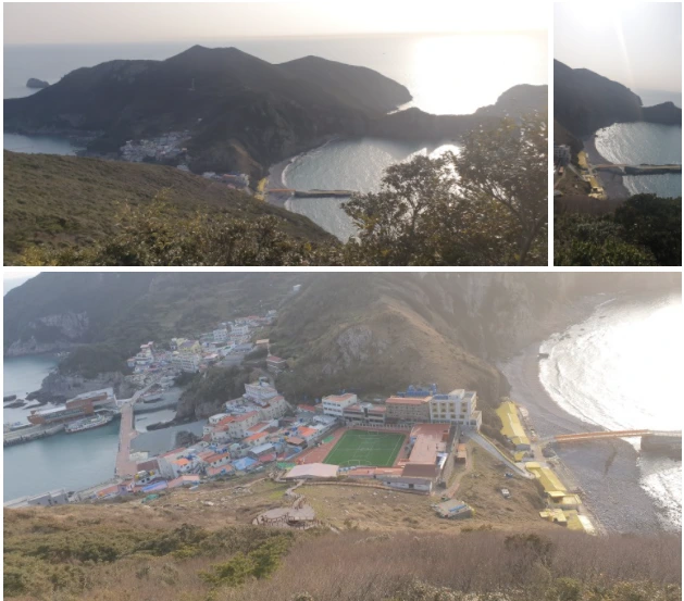 먼저 숙소에 짐을 풀고 간편복으로 홍도의 이름난 산인 깃대봉으로 올랐다. 깃대봉은 우리나라 100대 명산에 들 정도로 아름다운 산이다. 홍도 초등학교 뒤로 올라가면 두 갈림길이 나온다. 이정표가 가리키는 왼쪽 계단길을 올랐다. 처음부터 급한 계단이어서 천천히 올랐다. 어느 정도 오르니까 잠시 쉴 수 있는 전망대가 나왔다. 아래를 보니까 홍도가 한눈에 들어왔다. 선착장과 해안선 마을이 한눈에 들어왔다. 날씨는 이제 안개 한 점까지 없어져 있었고, 아름다운 마을의 모습과 붉은색 집들이 펼쳐졌다. 맑은 물에 선착장과 뒤편 몽돌해변의 있는 선이 개미허리를 연상할 정도로 잘록했다. 섬 전체는 밭이 거의 없고 관광지로 잘 가꾸어져 있었다.