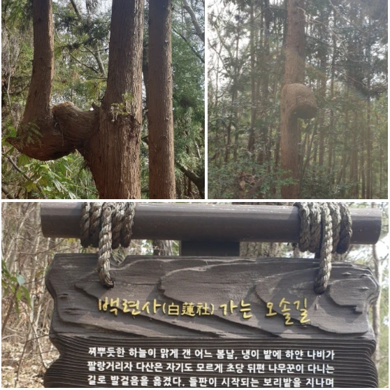 다산초당 양쪽에도 집이 있는데 동쪽 집 뒤로 오솔길이 있었다. 백련사로 가는 길이라 표시되어 있다. 유배생활이 적적할 때에 산 넘어 있은 백련사의 해장 스님과 오가면서 학문을 논하고 함께 차를 마시면서 벗으로 우정을 쌓았다. 이 길을 서로가 오가면서 만남을 가진 것이다. 그 길을 한번 가고 싶었다. 다산도 이 길을 걸었다고 생각하니까 오르막이지만 힘들지 않았다. 이 길은 편백나무가 많이 심어져 있었다. 수령으로 보아서는 요즈음에 심은 것이다. 그런데 이상하게 꼬인 나무가 있었다. 길은 오르막을 지나서 내려가는 길로 가니까 백련사가 나왔다. 백련사는 통일신라 말에 창건한 절로 만덕산 밑에 있다. 그래서 만덕 사라 고도한다. 백련사를 찾는 사람이 많은 것은 혜장 스님과 다산이 이야기와 다산초당에서 오솔길이 이곳까지 만들어져서 더 늘어났을 것이다. 또 백련사에는 천연기념물인 동백나무숲이 있기 때문이다.