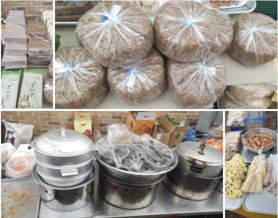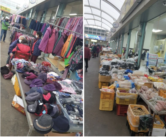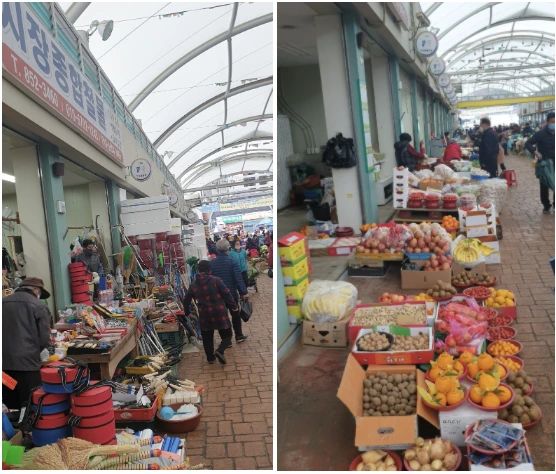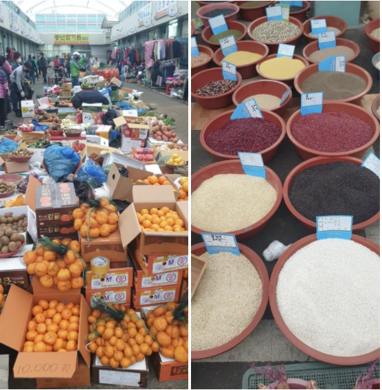 중간 통로에는 과일이나 채소가 가게가 자리 잡고 있었다. 중간 통로 왼쪽 공간은 한쪽만 곡물을 파는 공간이고 나머지는 시골에서 할머니들이 작은 물건을 가지고 나와서 자리 잡을 수 있는 공간으로 비교적 넓고 자리도 많았다.