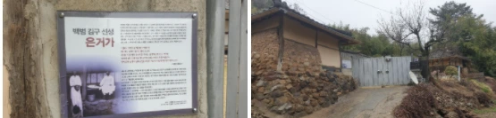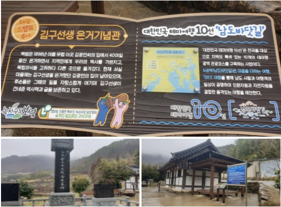 보성 오일장을 구경하고 다른 곳으로 이동하려고 나설 때도 봄비는 아침과 같이 차분하게 내리고 있었다. 조정래 작가의 태백산맥 기념관으로 출발했다. 가는 중간에 눈에 띄는 것이 있어서 예정에 없었지만 그쪽으로 먼저 갔다. 김구 선생은 은거 기념비가 있다는 표시를 본 것이다. 그곳에는 기념관과 기념비 그리고 은거한 집이 있었다. 민족의 지도자 명성에 맞게 잘 정비되어 있었다.