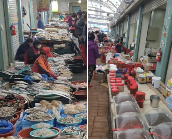 아침에 봄비가 내리고 있었다. 잠든 사이에 어제저녁이나 새벽에 조용히 내렸던 것이다. 봄비는 소리 내지 않고 숨죽여 내리는 듯하다. 그래도 창문 밖으로 보이는 온 들판이 젖어 있었다. 이른 아침에 비 내리는 보성 오일장을 찾았다. 보통 보성군청 부근에 있을 것을 예상해서 읍내를 다녀보니까 조용했다. 비가 와서 오일장이 서지 않는 것인가? 읍내에 다니는 사람도 많지 않고, 오일장이 서는 곳이 어딘지 알 수 없었다. 비가 오니까 더더욱 지나는 사람이 없었고 차들만 평소와 같이 다니고 있었다. 정류장에서 버스 기다리는 할머니에게 물어보니까 손으로 가리키면서 한참을 가서 좌측에 있다고 했다. 손이 가리키는 쪽으로 찾아가 보니까 오일장터는 비도 막아주고 잘 정비되어 있었다. 벌써 사람들이 많이 와 있었다. 보성 장터는 지붕은 현대식으로 만들고 공간은 세 칸으로 나누고 다시 중간 통로를 만들어서 구분 지게 장터가 정비되어 있었다. 중간 통로 오른쪽 첫 번째 공간은 우측은 각종 해물을 파는 공간이고 좌측은 말린 건어물을 파는 전포들로 형성되어 있고, 두 번째 공간 우측은 젓갈류 점포이고, 좌측은 주방용품, 철물과 플라스틱 제품을 팔았다. 마지막 세 번째 공간은 우측은 옷 가게가 같이 있었고, 좌측은 신발이나 모자 양말 같은 잡화를 파는 가게가 들어와 있었다.