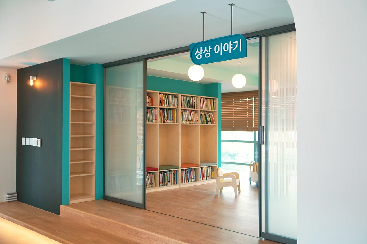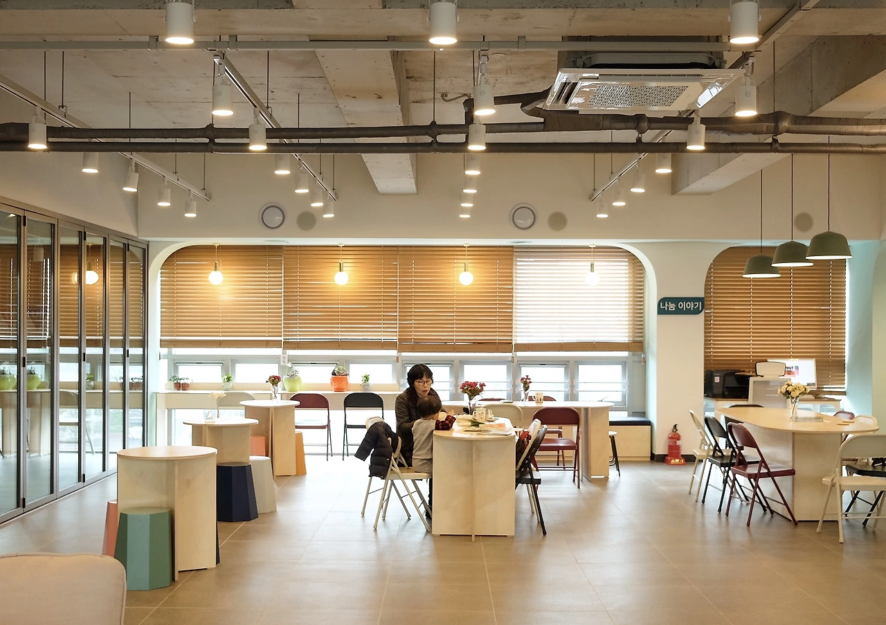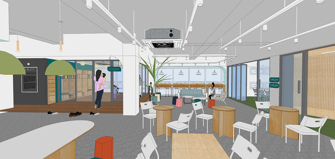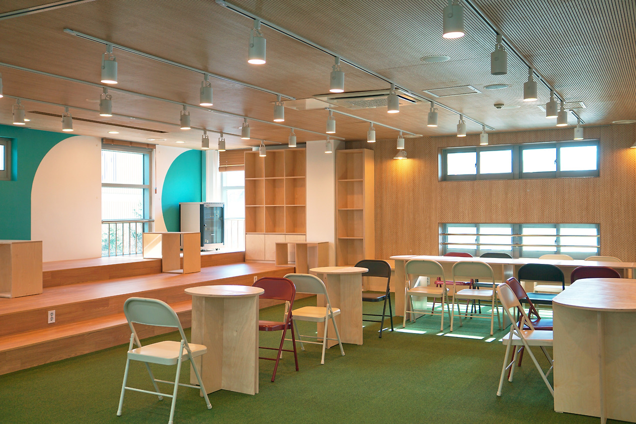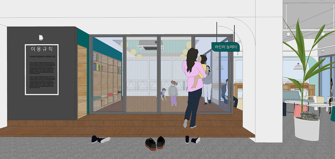 어린이 공간은 아이들이 신발을 벗고 뛰어놀 수 있는 좌식 공간으로 계획하였고, 아이들과 동행한 부모님들이 아이들을 확인할 수 있게끔 안이 들여다보이는 공간으로 계획하였습니다. 어린이공간 안쪽에 숨어있는 수유실은 지역에 있는 젊은 어머니들이 좀 더 편하게 아이들과 함께 이곳에 올 수 있도록 공간을 쪼개 계획하였고, 홀에 있는 유모차 주차장 또한 더 많은 젊은 엄마들이 함께 할 수 있는 공간이 되길 바라며 계획에 반영하였습니다.
