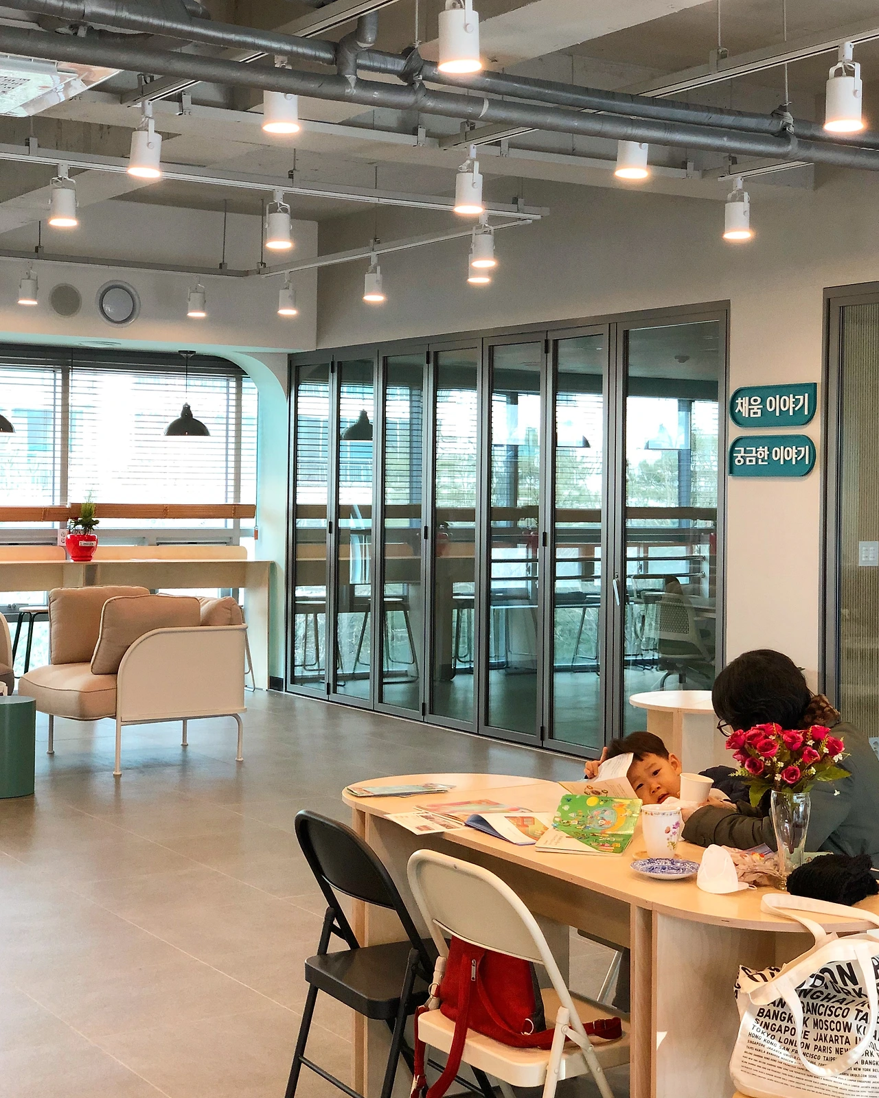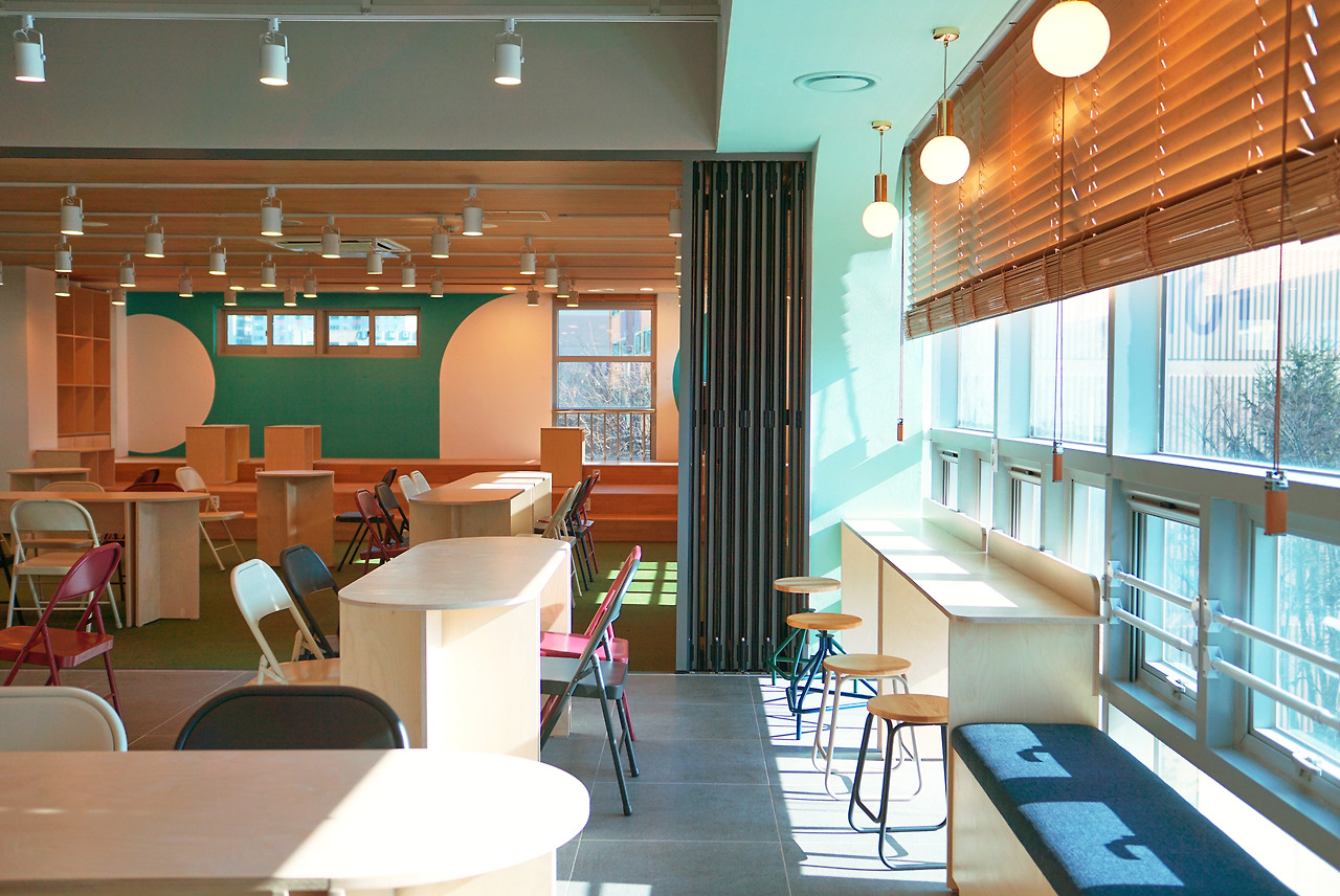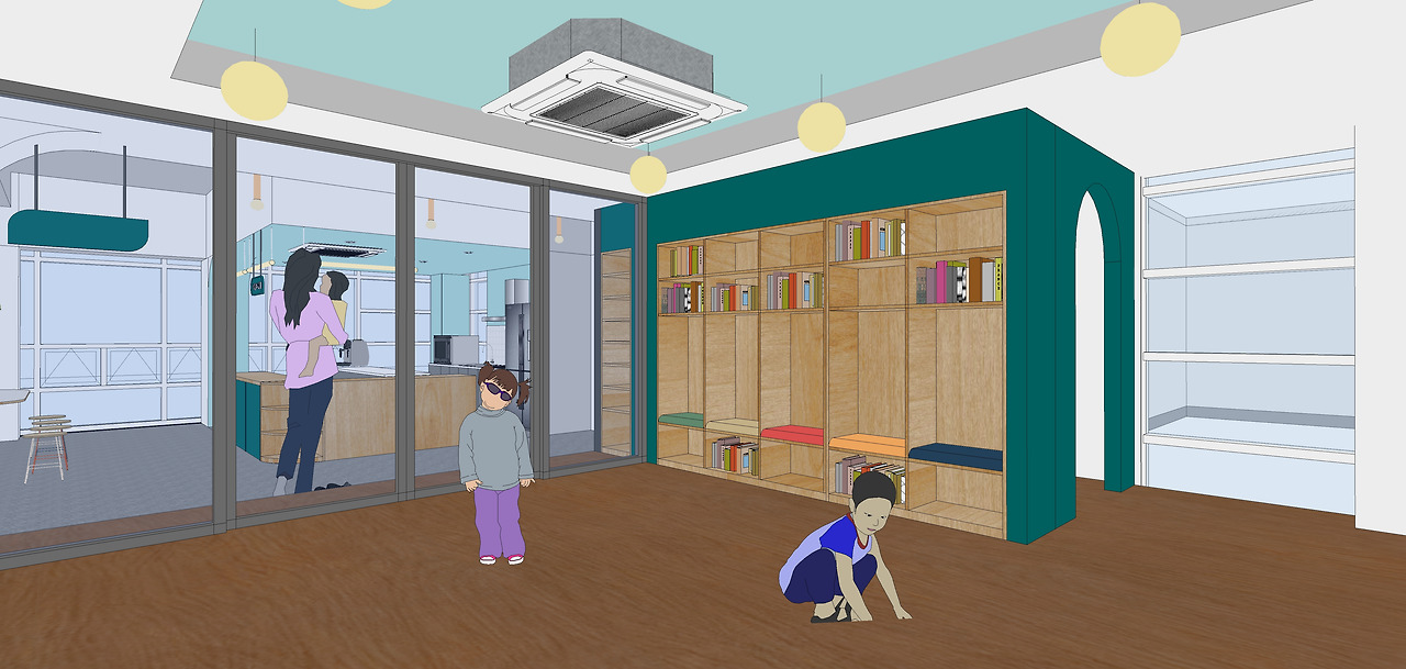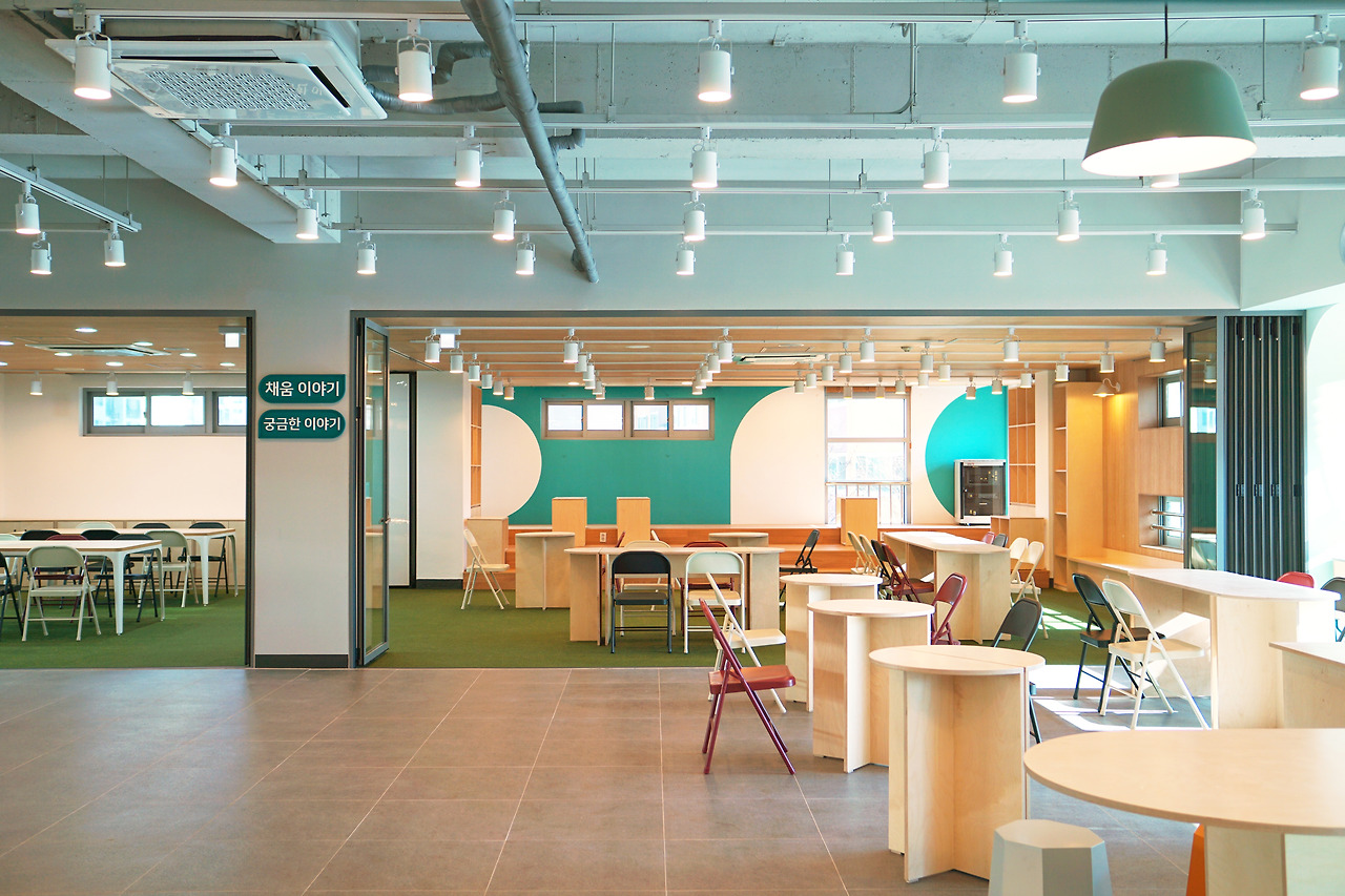 어린이 공간은 아이들이 신발을 벗고 뛰어놀 수 있는 좌식 공간으로 계획하였고, 아이들과 동행한 부모님들이 아이들을 확인할 수 있게끔 안이 들여다보이는 공간으로 계획하였습니다. 어린이공간 안쪽에 숨어있는 수유실은 지역에 있는 젊은 어머니들이 좀 더 편하게 아이들과 함께 이곳에 올 수 있도록 공간을 쪼개 계획하였고, 홀에 있는 유모차 주차장 또한 더 많은 젊은 엄마들이 함께 할 수 있는 공간이 되길 바라며 계획에 반영하였습니다.