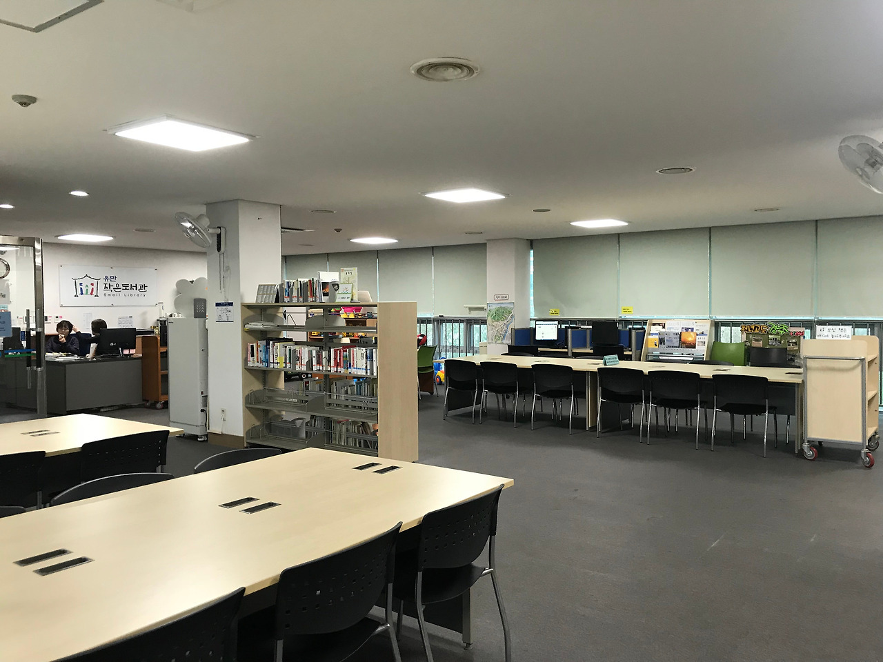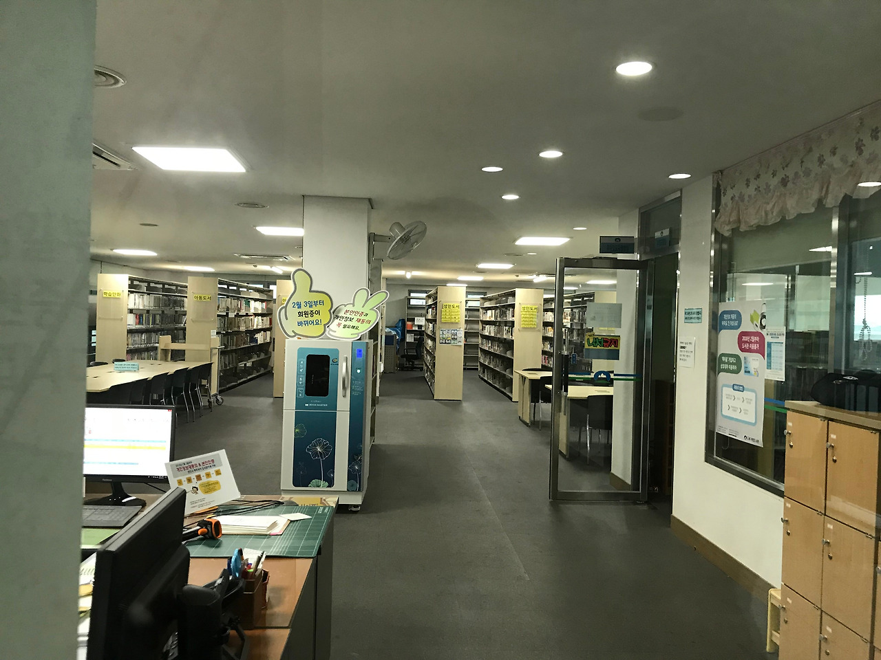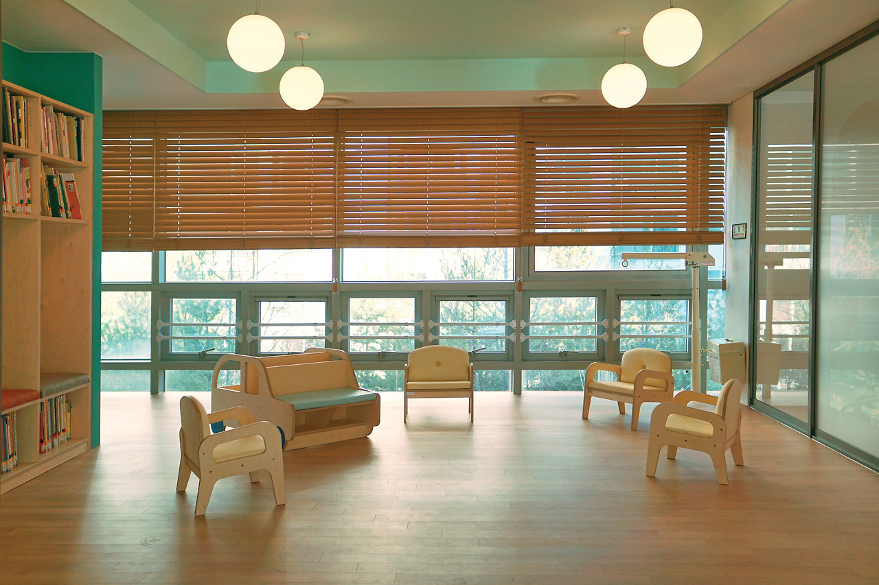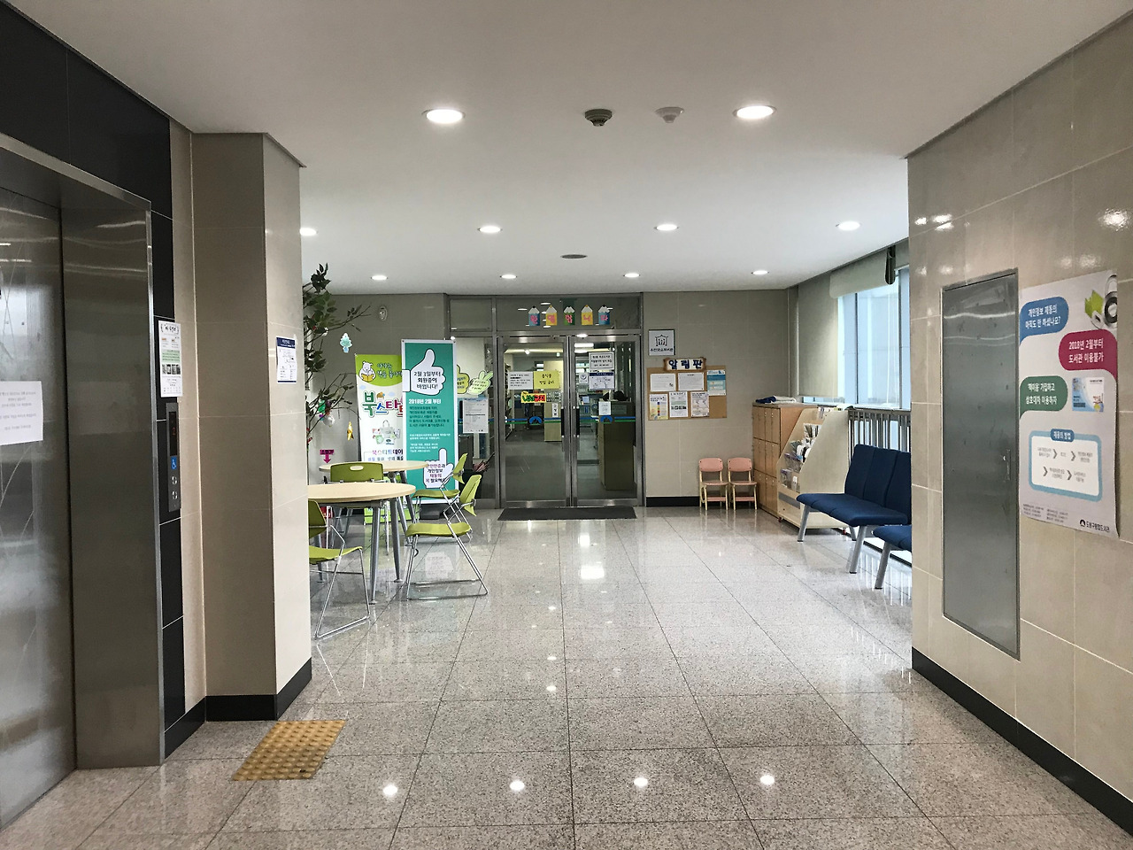 어린이 공간은 아이들이 신발을 벗고 뛰어놀 수 있는 좌식 공간으로 계획하였고, 아이들과 동행한 부모님들이 아이들을 확인할 수 있게끔 안이 들여다보이는 공간으로 계획하였습니다. 어린이공간 안쪽에 숨어있는 수유실은 지역에 있는 젊은 어머니들이 좀 더 편하게 아이들과 함께 이곳에 올 수 있도록 공간을 쪼개 계획하였고, 홀에 있는 유모차 주차장 또한 더 많은 젊은 엄마들이 함께 할 수 있는 공간이 되길 바라며 계획에 반영하였습니다.