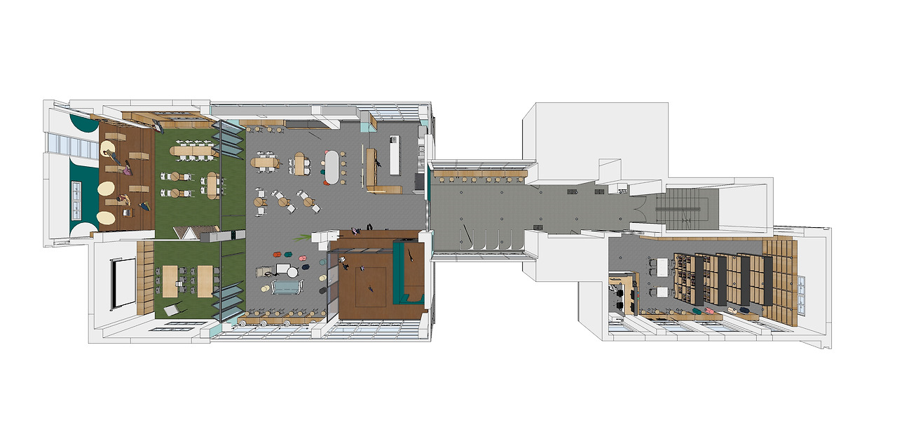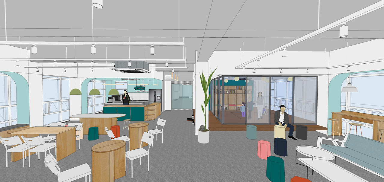 3층은 크게 홀을 중심으로 두 공간으로 나눌 수 있습니다. 기존 큰 공간을 사용하던 작은 도서관이 규모를 줄여 이사를 하기로 했고, 큰 공간을 활력소 공간으로 조성할 수 있었습니다. 활력소 공간에는 크게 어린이공간, 주방공간, 소모임공간 등을 계획하기로 워크숍 과정을 통해 정리되었고 소모임 공간은 사용 규모에 따라 다양한 형태가 가능하도록 가변형 구조로 계획하였습니다. 이 가변형 구조들은 큰 마을의 행사들을 진행할 때 모두 한공간으로 사용할 수 있도록 하였습니다.