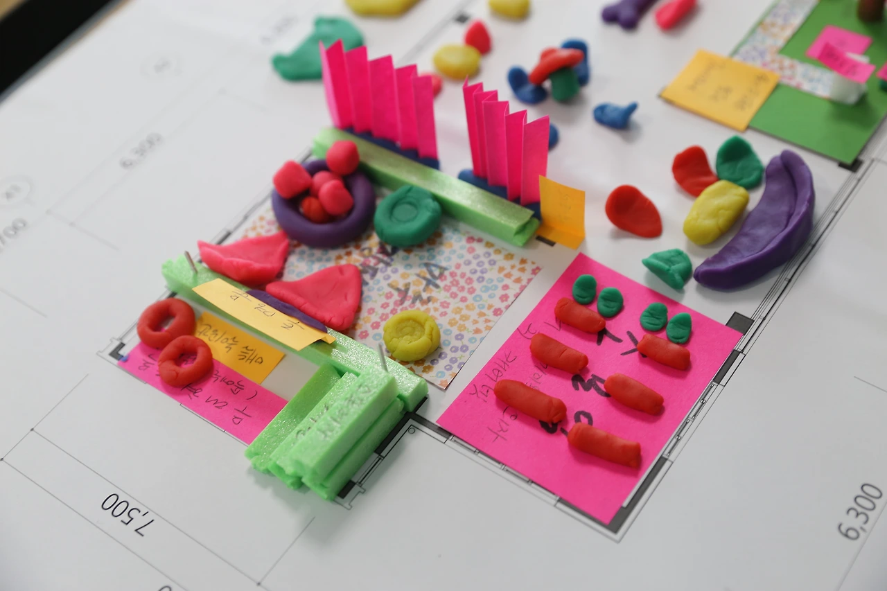 워크숍의 시작은 항상 각자의 필요와 우리의 필요를 확인하는 시간을 갖습니다. 내가 생각하는 공유공간과 다른 사람이 생각하는 공유공간의 차이도 워크숍을 통해 알아갑니다. 그렇게 생각이 모이고 활력소 공간에서 하고 싶은 일들이 점점 구체화 될 때 즈음 그럼 공간을 어떻게 바꾸면 좋을지를 이야기합니다. 공간디자인은 전문가의 분야이기 때문에 좀 더 쉽게 의견을 나눌 수 있는 툴들을 활용하여 워크숍을 진행하였습니다. 우리가 만들고 싶은 공간의 사례 이미지들을 찾아 필요한 요소를 오려 붙여 하나의 그림을 같이 만들기도 하고, 실제로 3차원으로 지점토를 통해 공간을 작게 만들어 보기도 하였습니다. 이 과정 속에서 공간을 어떻게 운영할지, 어떠한 프로그램으로 채우게 될지를 고민하여 그에 맞는 디자인으로 합의를 해 나가는 과정을 갖습니다.