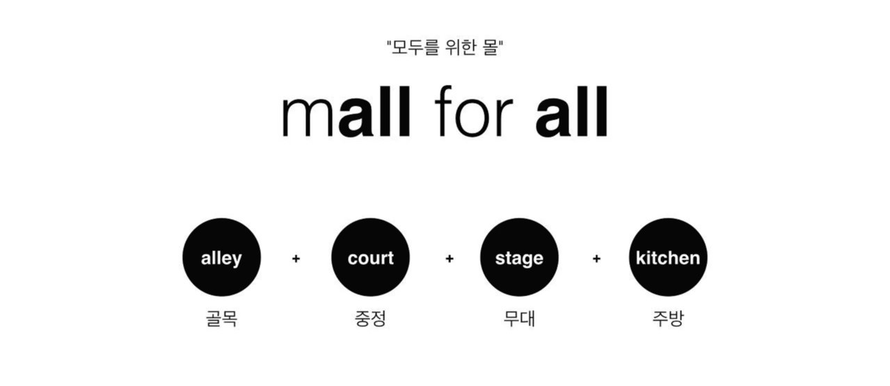 청년몰 디자인 역시 다양한 성격의 점포가 맥락 없이 혼재되어 있다 보니 머물지 못하고 스쳐 지나가는 공간으로 정체되어 있습니다. 경동시장 청년몰은 장소성, 쾌적성, 편의성을 목표로 ‘모두를 위한 몰(mall for all)’이라는 설계 개념을 정하고, 골목(alley)과 중정(court), 무대(stage), 주방(kitchen)을 중심으로 오래 머물고 싶은 쾌적한 공간을 계획하였습니다.