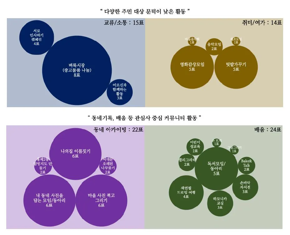 워크숍 결과 홍제커뮤니티센터에서 하고 싶은 프로그램 또는 활동은 교류/소통, 취미/여가, 동네 아카이빙, 배움 등 4가지 분야로 묶였습니다. 다른 공유공간 프로그램과 달리 동네를 기록하는 활동인 '동네 아카이빙'이 22표로 가장 많은 선택을 받았는데요. 워크숍에 참여한 주민운영위원들의 우리 동네에 대한 애정을 느낄 수 있었습니다.