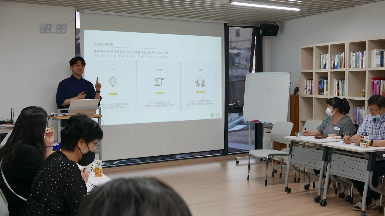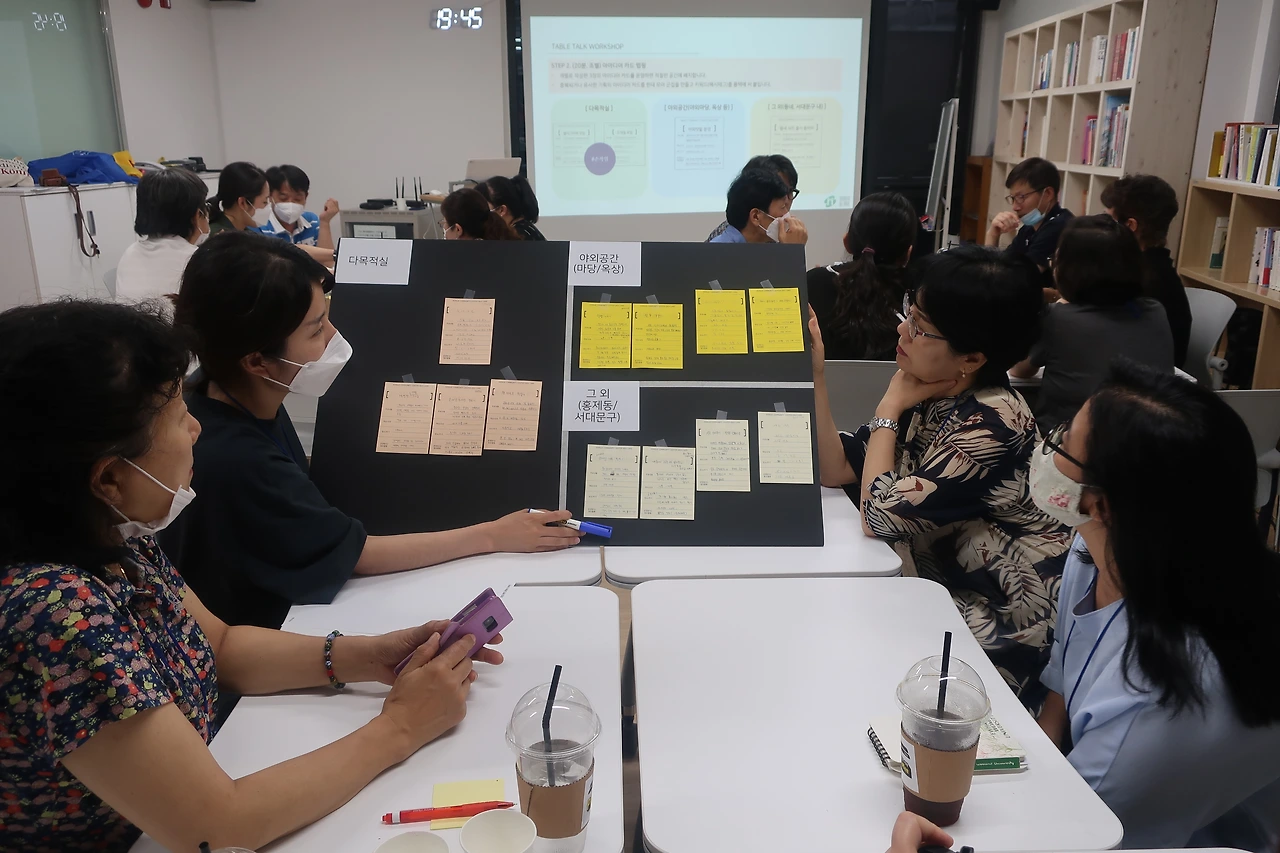 더불어 홍제커뮤니티센터라는 '공유공간'의 개념과 사례를 공유하였습니다. 공유공간이 무엇인지 사례를 중심으로 설명하고, 간단한 워크숍을 통해 세대와 환경, 성별에 따라 상이한 공유공간의 경험을 서로 나누고 공유하는 시간을 가졌습니다.