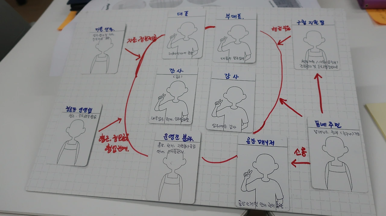 보드게임 진행 결과, 공간 주요 키워드로 '교류', '소통', '배움', '나눔' 등 4가지로 도출되었습니다. 상대적으로 좁은 홍제커뮤니티센터 내부 공간의 단점을 야외마당, 옥상, 테라스 등 외부공간을 적극적으로 활용하는 방안을 제안하였습니다. 필요한 역할은 주민운영위원이 중심이 되어 운영진을 꾸리는 형태로 의견이 모아졌습니다. 주민운영진은 대표, 부대표, 간사 등 임원을 중심으로 한 주민운영위원으로 꾸리고, 공간매니저와 행정은 협력, 지원하는 역할로 설정하였습니다.