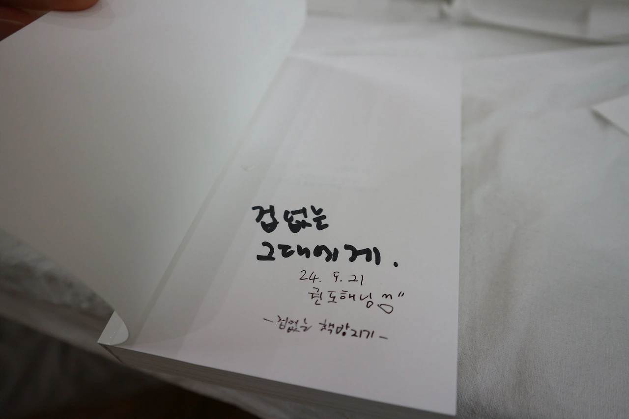 나의 첫 책은 커피문고 대표님이 담아주셨다. 겁책모음zip 첫 사인이다. 요요님은 첫 사인을 어떻게 써드릴지 고민했는데, 첫 구매 손님이 한 바퀴 돌고 오겠다고 하며 시간을 넉넉히 주셨다. 친구들과 한 달에 한 권씩 책을 나눈다는 손님의 이야기를 들으며 솔림작가님도 오늘 첫 사인을 멋지게 했다.