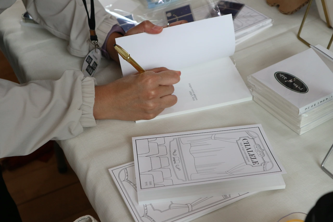 오늘 우리는 올해 각자 책으로 북마켓 첫 데뷔이자 사인도 첫 데뷔다. 수줍은 그때의 순간을 담아보는 것도 빠질 수 없지! 찰칵 찰칵! 셔터 누르기 바빴다.