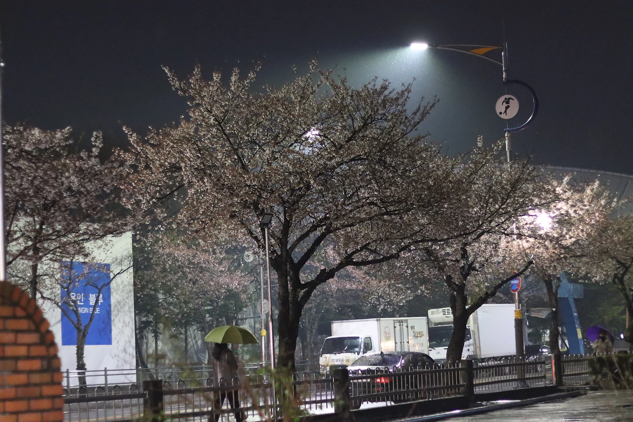 오늘 촉촉한 비와 떨어지는 벚꽃 사이로