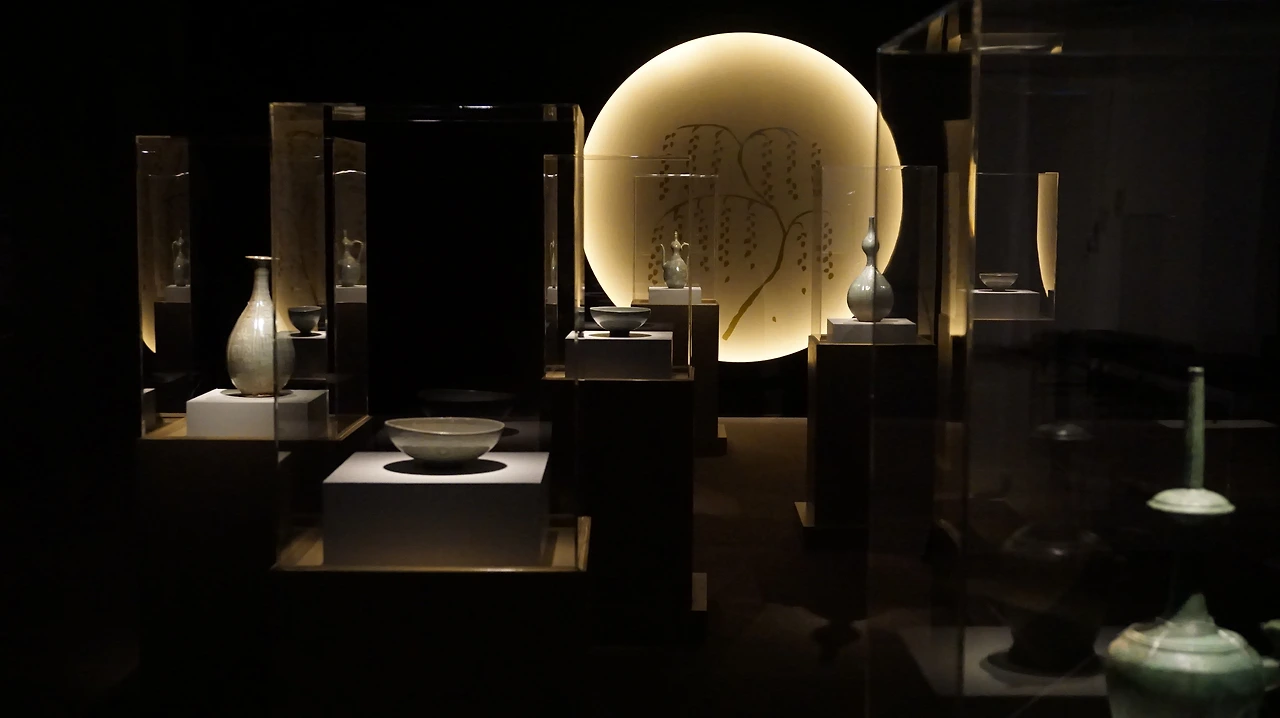 전시된 8점의 문화재 중 2점이 금속공예품, 나머지 6점이 고려청자였는데 신기하게도 모두 상감청자였다. 2점의 사발에는 운학문이 새겨져 있었지만 나머지는 대부분 물가의 풍경을 담은 점이 흥미로웠다. 보름달처럼 만든 벽에 구현한 그림도 이번 전시 기물들에서 반복적으로 보이는 버들문이다. 이번에 한국에 오게 된 것들이 특히 그랬는지, 아니면 벨기에 왕실이 사들인 취향이었는지는 모르겠다. 만약 취향이라면 상감청자에서 보이는 회화가 특히 직관적이기 때문은 아닐지 짐작해 보는데 물가 풍경을 쏙쏙 골라낸 걸 보니 제법 풍류를 좋아하셨군요, 하며 혼자 쿡쿡 웃었다.