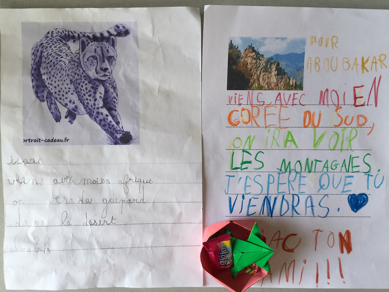 셋째는 한 손에 종이 한 장을 들고 돌아왔다. 아부바카가 셋째를 위해 쓴 편지였다. “나랑 같이 아프리카 가자. 가서 사막에서 치타 보자.” 셋째와 같은 학년인데 글씨를 훨씬 잘 썼다. 셋째가 이웃집에 다녀온 그 짧은 시간 동안 내 머릿속을 스쳤던 생각들 때문에 조금 무안했다. 그래서인지 편지를 보며 셋째 앞에서 오버액션을 했다. “아부바카 최고다. 너무 멋지다.” 하면서 말이다. 이번에는 첫째와 둘째가 부산하게 움직였다. 셋째가 답장을 쓸 차례였다. 첫째가 물었다. “아빠, 한국에서 유명한 동물이 뭐죠?” 나는 “어어, 호랑이?”라면서 말꼬리를 흐렸다. 아니, 그건 호랑이 담배 피우던 시절 이야기지. 나는 다시 “아니, 호랑이 아니야.”라고 정정했다. “세계에서 해가 처음으로 뜨는 나라니까 해 보러 같이 가자고 해.” “먹는 건 뭐가 유명하죠?” “불고기!” 나는 아이들의 숙제에는 별 도움이 안 되는 아무 말이나 하고 있었다. 얼마 후 셋째가 완성된 편지를 가지고 나타났다. “나랑 같이 산 보러 한국 가자. 네가 오길 바랄게.” 아프리카의 치타보다 강력하지는 않았지만, 호랑이나 불고기보다는 낫다는 생각이 들었다. 아이들은 편지와 마이쮸 두 개, 색종이로 접은 개구리를 들고 이웃집에 가서 전달하고 왔다. 이웃 아주머니는 아이들 손에 직접 만든 쿠키를 들려 보냈다.