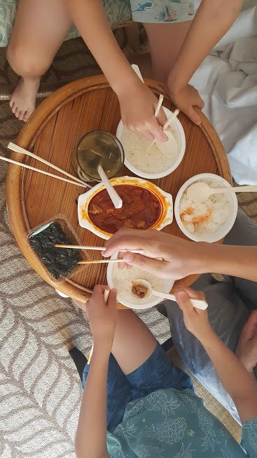 하와이 호텔은 조식이 없다. 조식 포함 호텔 상품은 잘 나오지도 않거니와 있어도 너무 비싸서 선택할 수가 없다. 하와이의 첫 아침을 숙소에서 해결했다. 한국에서 가져간 김치돼지찜, 햇반, 미소된장으로 먹은 아침은 아직도 생각날 정도로 맛있었다. 숙소 전체에 하나 있는 전자레인지까지 가려면 5분이 넘게 걸어야 했고, 김치 냄새가 퍼질까봐 우리는 조심스럽게 김치돼지찜을 데워왔다. 미소된장은 룸 안에 있는 포트로 물을 끓이고 유리컵을 사용했다. 남편은 하와이 현지 음식을 최대한 많이 먹고 싶어 해서 내가 한국에서 인스턴트 음식을 바리바리 챙길 때 마땅치 않아했었다. 남편 입장에서는 하와이 맛있는 음식을 먹을 기회가 트렁크의 한국 음식 양만큼 줄어드는 것이었다. 반면에 나는 어떤 밥보다 누가 해주는 밥이 제일 맛있는 대한민국 주부이지만, 맛집을 검색하는 시간과 비싼 하와이 식비를 생각하면 레트로트 식품과 전자레인지 만으로 간단히 해결하는 아침도 땡큐이다. 김치돼지찜은 너무 맛있어서 빨간 소스가 흔적도 안 보이게 밥을 싹싹 비벼먹었다.