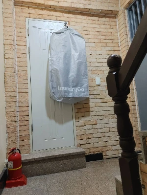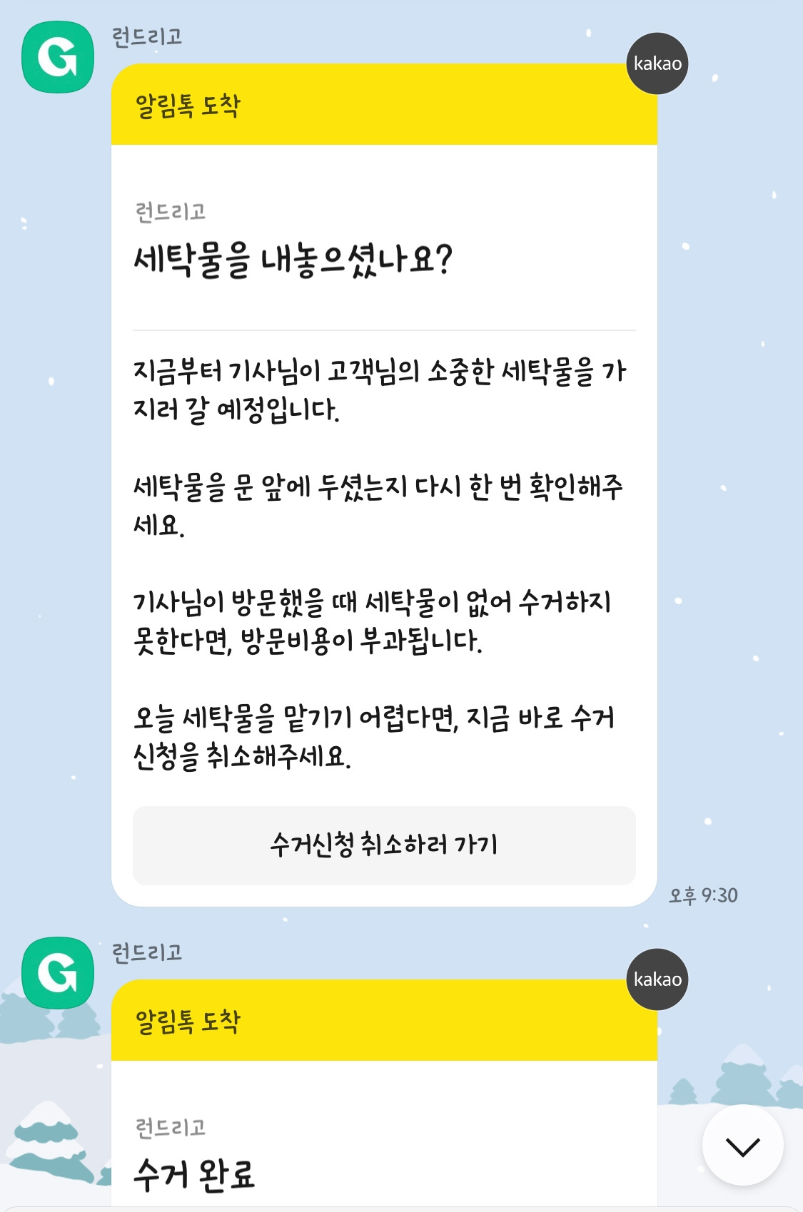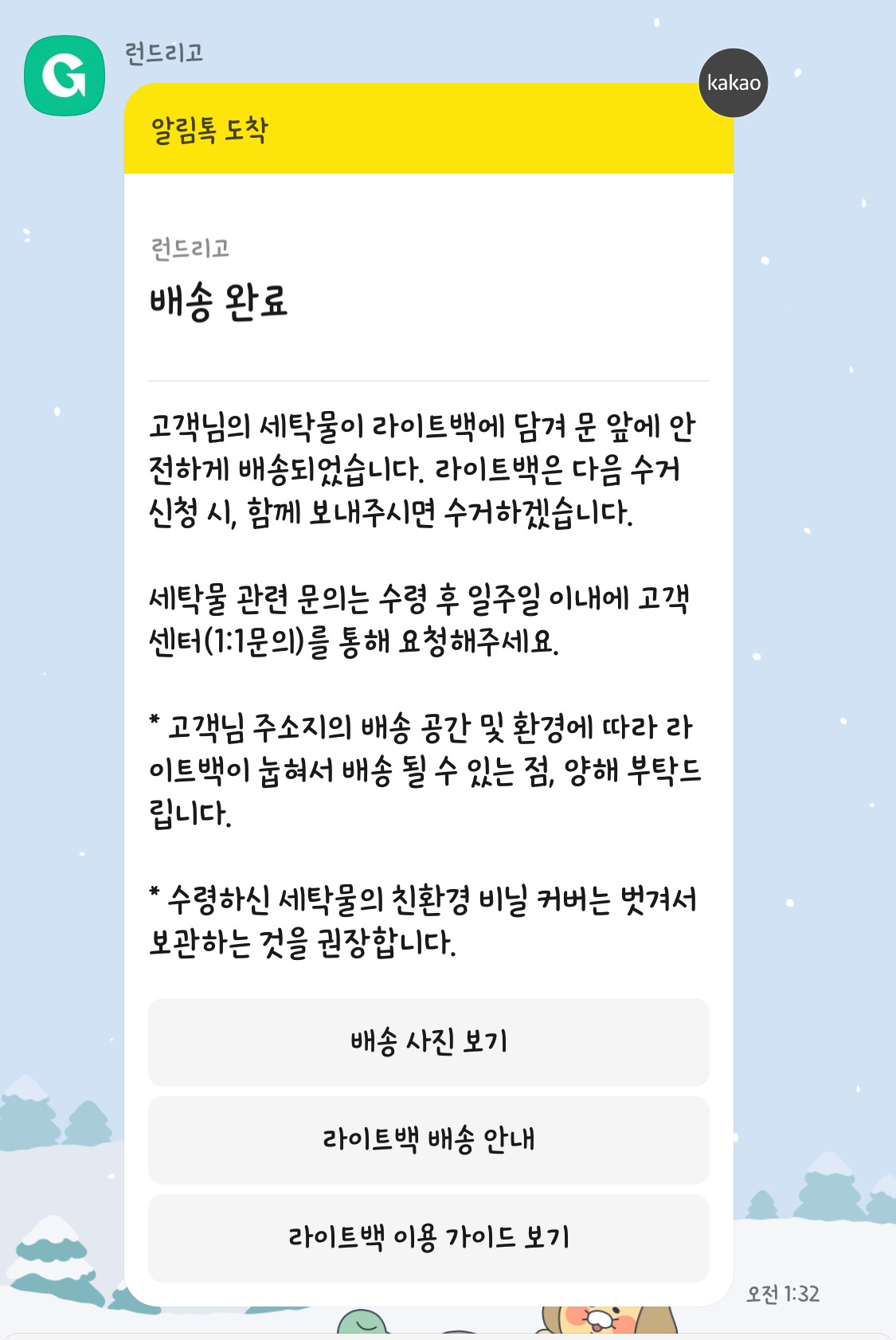 세탁물 수거를 주문함과 동시에, 카톡으로 세탁물을 내놓으셨냐고 친절한 안내 메시지가 온다. 기사님이 방문했을 때 세탁물이 없어서 수거하지 못하면, 방문비용이 부과되기 때문. 그래서 옷을 내놓음과 동시에 주문을 해야 하는 것이 팁이다. 수거가 완료됐을 때도 현장에 둔 내 종이백 사진과 함께, 잘 수거 됐다고 안내 메시지가 오고, 바로 다음 날 하루 만에 세탁이 완료돼서 런드리고 라이트백에 담긴 세탁물이 집 문 앞에 걸려있었다.