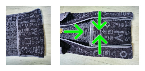 1-핫팩을 올리고 왼쪽을 뒤로 조금 접어준다 2-오른쪽은 핫팩까지 접어 올린다