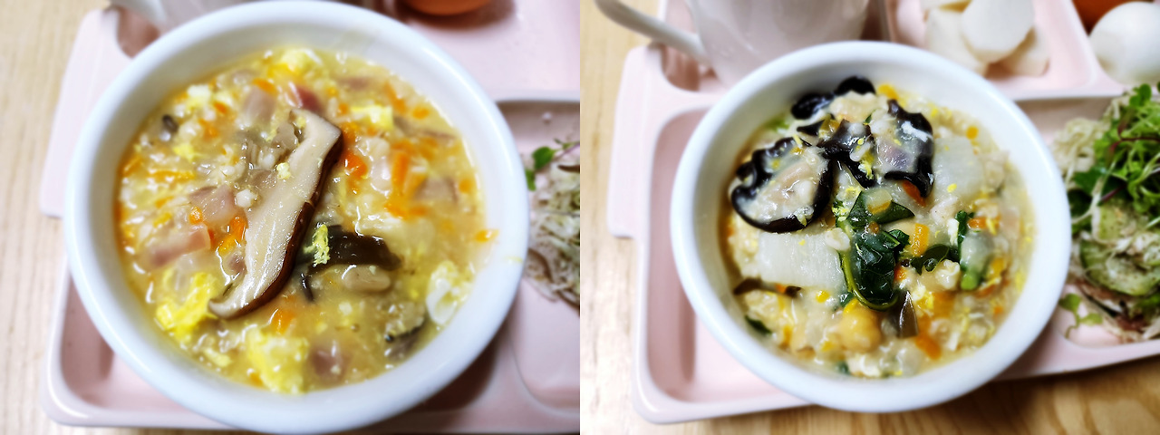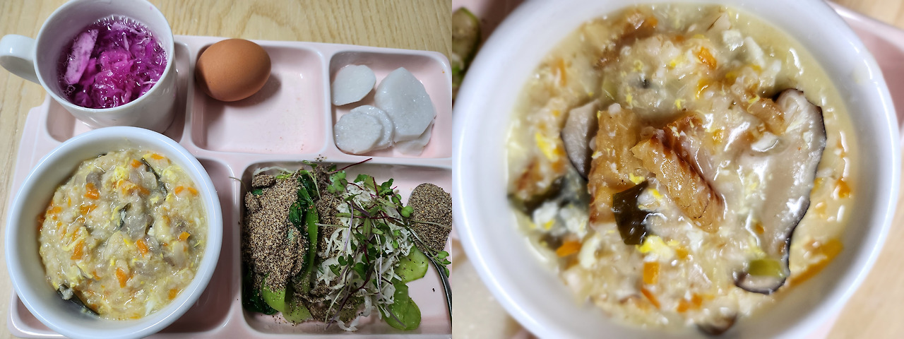 6월 24일 아침. 버섯계란오트밀죽을 시작으로 아침마다 다양하게 죽을 만들어 먹고 있어요. 2인 기준 100~120g 정도 넣어 요리하는데요. 200ml 컵으로 한 컵 정도 되더라고요. 과하게만 먹지 않는다면 오히려 딸과 나에게는 장점이 더 많은 아침 식사라고 판단했어요. 오트밀죽만 먹는 건 아니고요. 채소 샐러드는 기본이고, 양배추발효김치, 찐 계란(찜기에 쪄낸) 한 개, 마. 아침 식사 구성은 보통 요렇게 먹고 있어요.