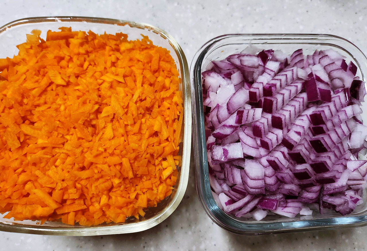 항상 죽에 사용하는 당근과 양파는 미리 준비해 두면 시간을 절약할 수 있어요