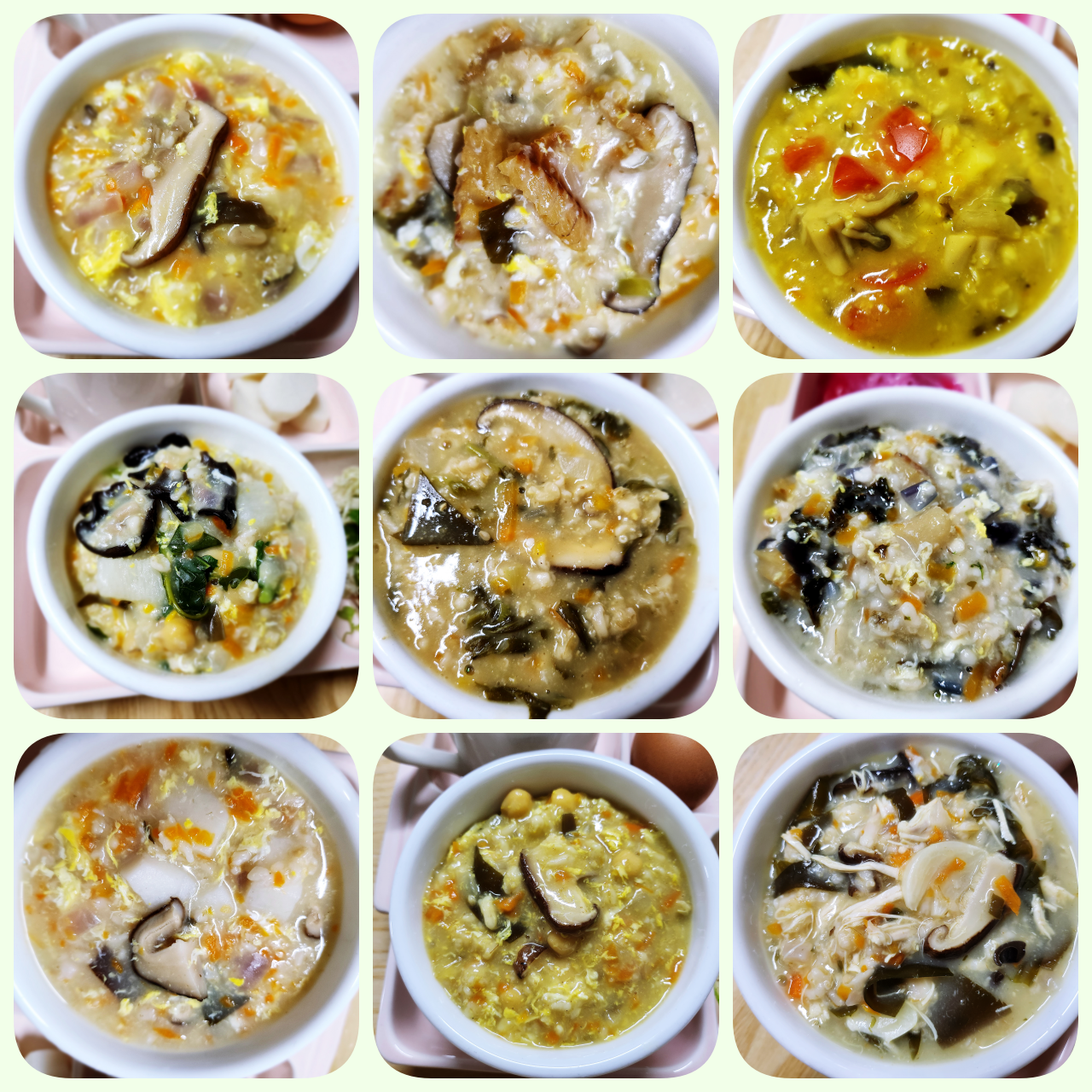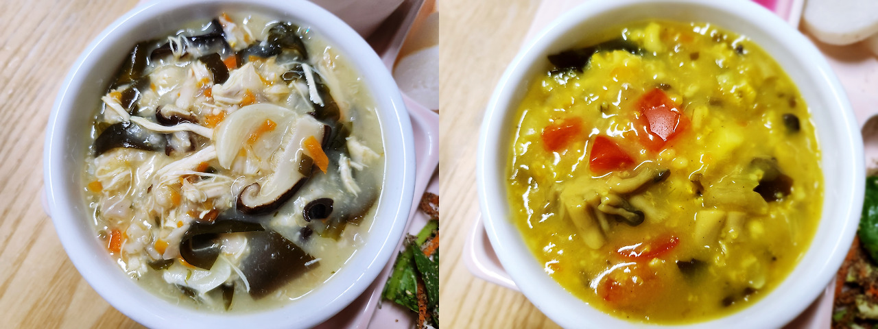 미역 닭가슴살 오트밀 죽(백숙 맛나게 먹고 남은 닭가슴살 이용했어요) / 카레 오트밀 죽(카레를 좋아해서 카레 죽이 많네요)