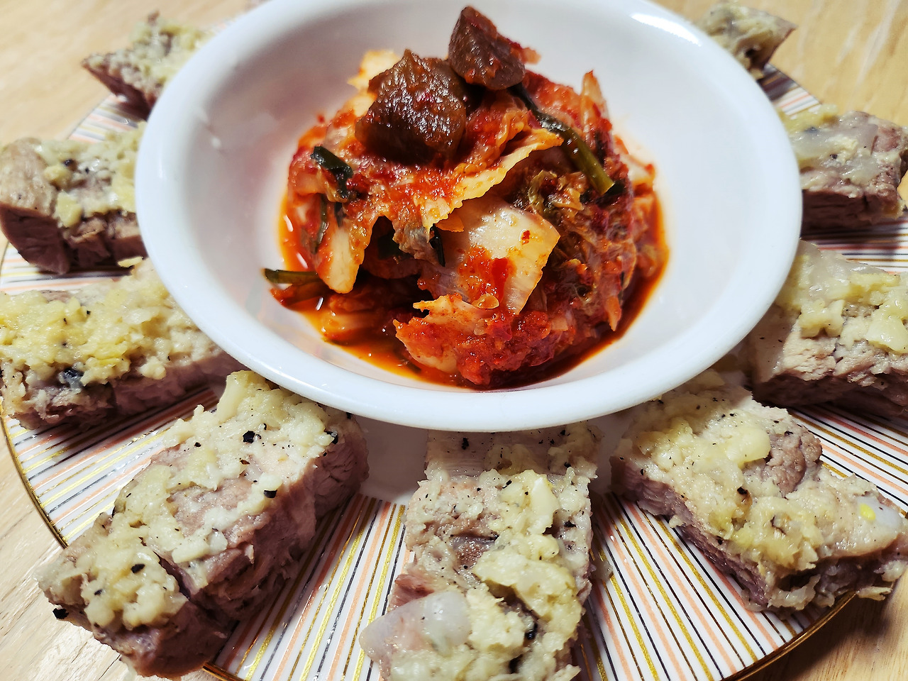 마늘 보쌈을 찬찬히 음미할 때 돼지고기에 스며든 마늘, 생강, 후추, 월계수 잎 향. 서로 다른 네 가지 맛이 모두 느껴진다. 마치 천상의 하모니 ‘크로스오버(crossover)’를 듣고 있는 듯하다. 대단한 재료가 들어간 것도 아닌데 이렇게까지 훌륭한 맛을 느끼게 해 줘서 고마울 따름이다.