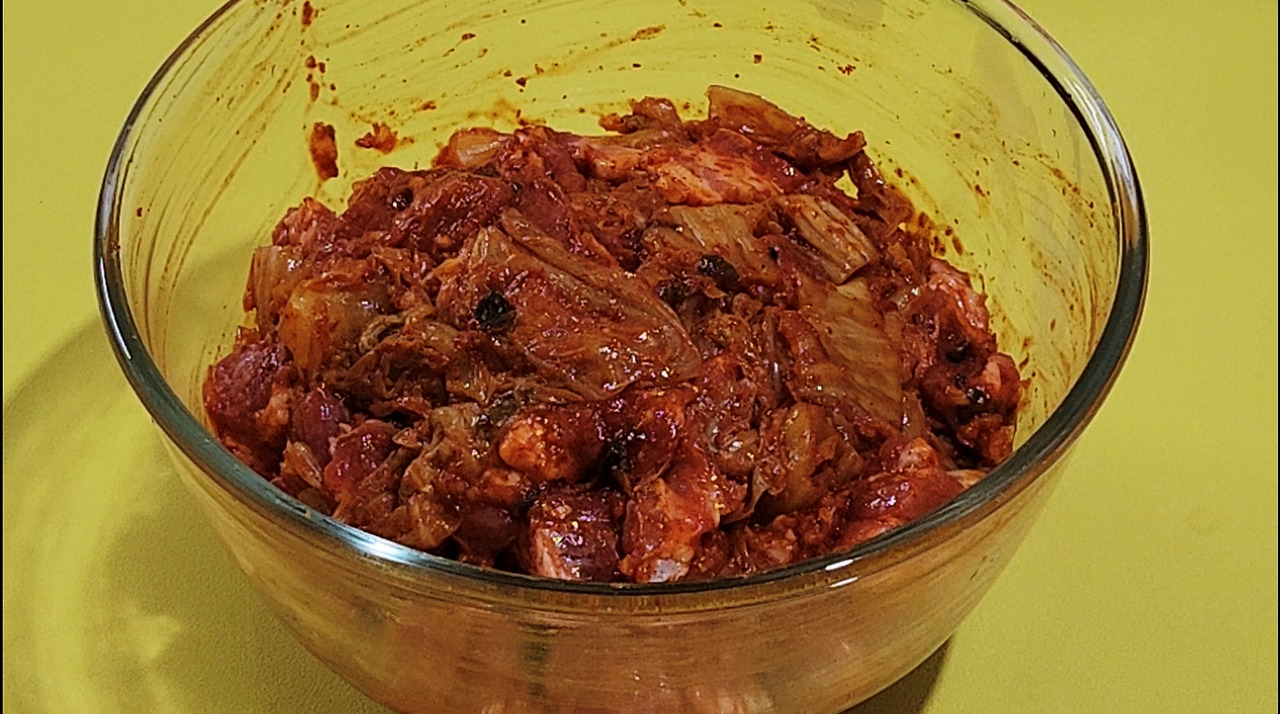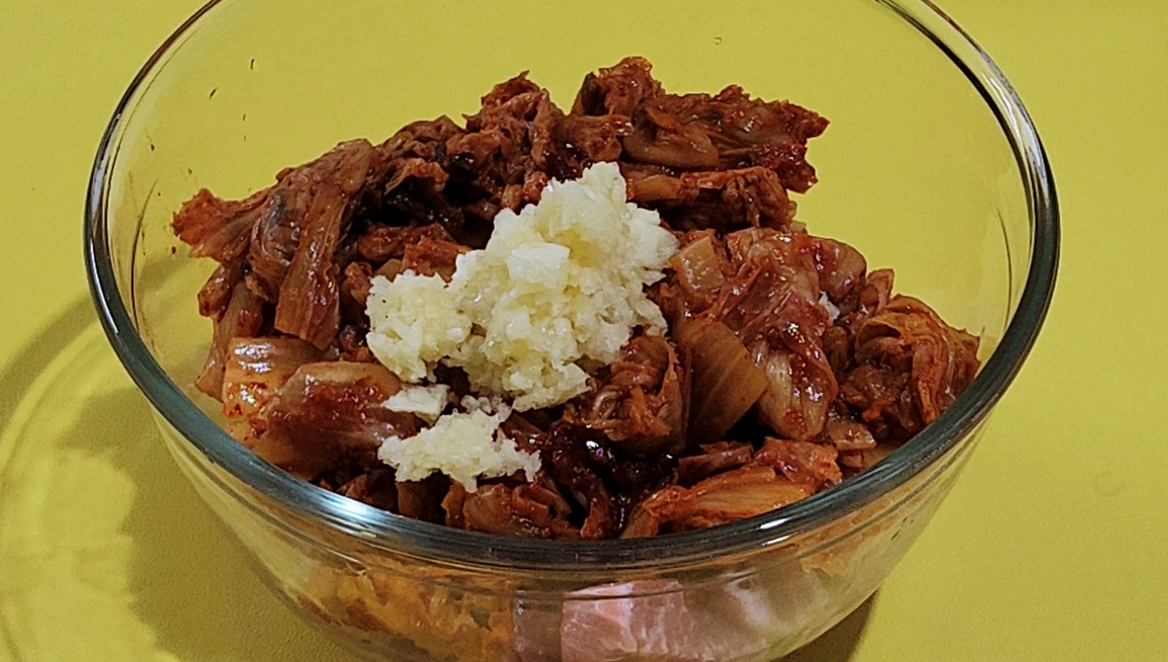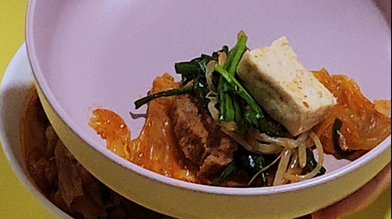 돼지고기에 익은 김치 적당히 넣고 고추장, 고춧가루와 잡내를 잡아주는 다진 마늘도 넣어 고기에 양념이 배도록 조물조물해 준다. 중불에 20분 정도 우려놓은 건표고, 건다시마 국물에 돼지고기 김치를 퐁당 넣어 충분히 익힌 다음 딸이 좋아하는 양파, 두부, 숙주를 넣고 소금으로 간을 한다. 숙주가 적당히 익으면 부추를 넣고 10초 후 불을 끈다.