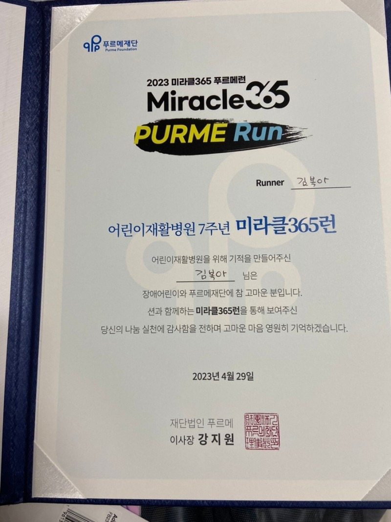 그래서 션이 주관하는 행사에 지금 2번 참여했다. 첫 번째는 '푸르메재단의 넥슨어린이재활병원 7주년 행사'였다. 처음 해 봐서 4km(런앤워크)에 도전했는데... 생각보다 느려서 결국 완주는 5km 팀과 함께 하게 되었다. 이때 뛰면서 나는 느꼈다. 혼자 뛰는 것보다 팀을 이루어서 뛸 때 덜 지치고 완주할 힘이 생겼다. 그리고 러닝을 하면서 나의 호흡에 집중에 하며 뛰는 거 자체가 너무 좋았다. 그리고 이 완주를 하고 나는 3일 동안 온몸에 근육통이 왔다. 하지만 시달린 후 몸은 더 건강해졌다.