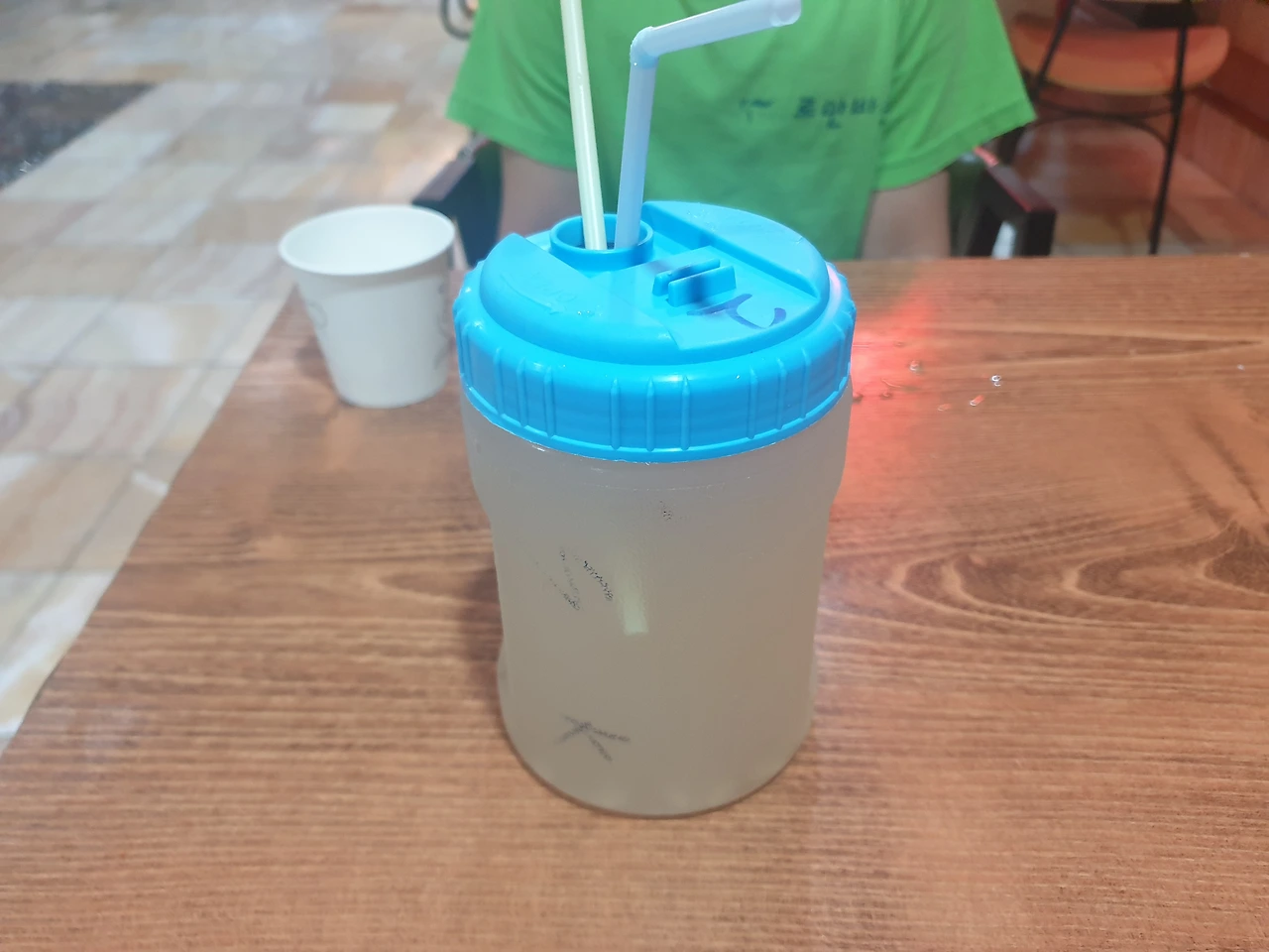 투명한 플라스틱 컵에 담긴 누르스름한 식혜,