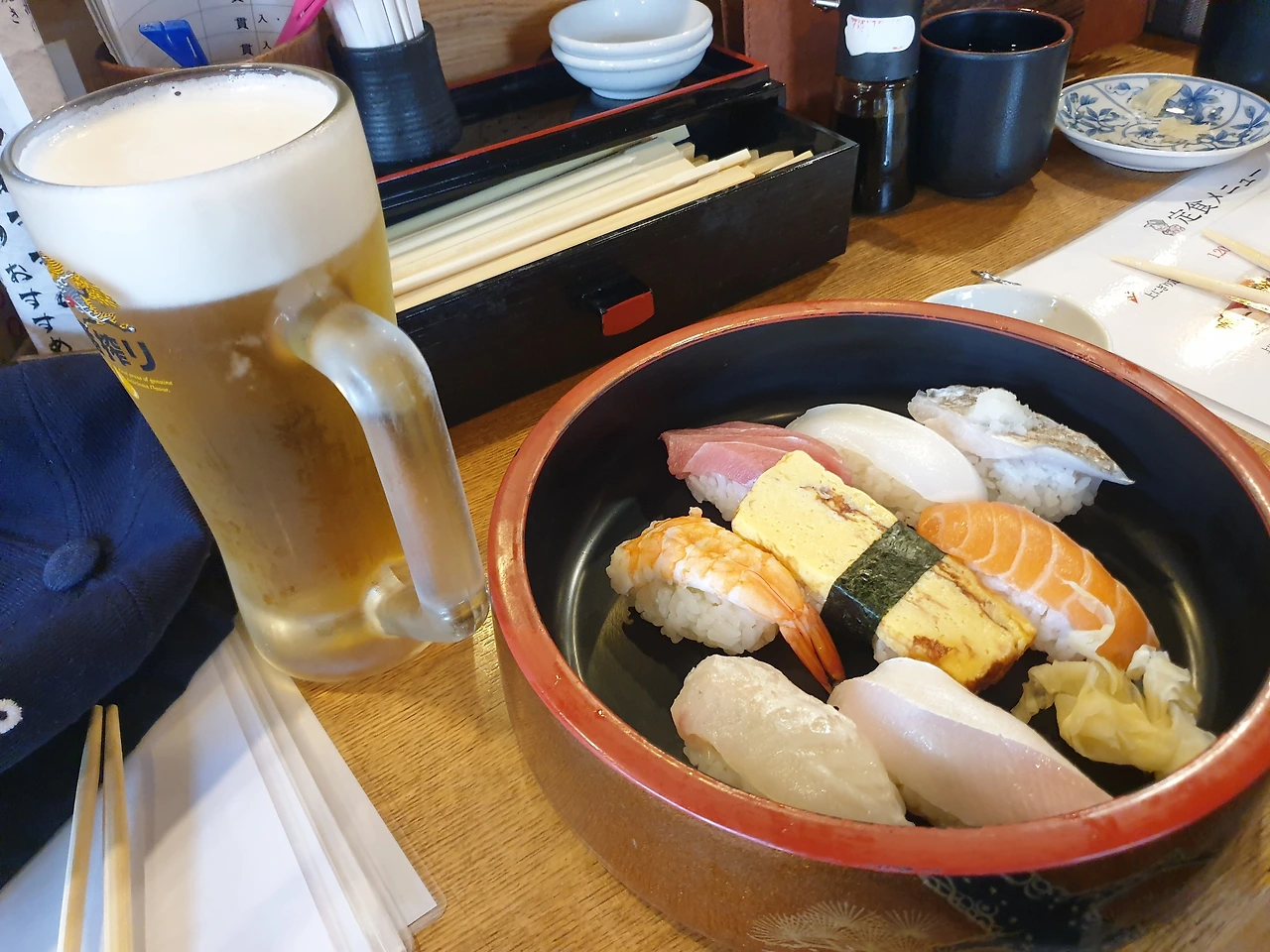 맥주를 마시다 보면, 초밥을 한 입.