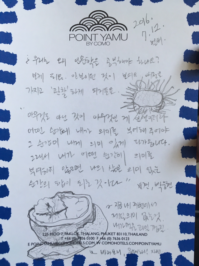여행을 다니면서 느꼈던 것 중에 하나가 '여행은 일상처럼, 일상은 여행처럼' 살고 싶다는 것이었다. 박웅현은 말한다, '어떤 순간에 내가 의미를 부여해주어야 그 순간이 내게 의미 있게 다가옵니다. 그래서 내가 어떤 순간에 의미를 부여하면 나의 삶은 의미 있는 순간의 합이 되는 것이고, 내가 순간에 의미를 부여하지 않으면 나의 삶은 의미 없는 순간의 합이 되는 것이에요.(123)' 내가 한없이 의미 없어 보였을 때가 있다. 존재하는 이유를 아무리 고민해보아도 살아있는 것이 무기력했었다. 그때 나한테 왔던 이 책이 나를 더 관찰하게 했다. 나를 바라보고 나의 가족을 바라보고 내 옆을 스치는 풀들을 바라보게 되었다. 천천히 걸으며 천천히 이야기했고 그림을 그리며 관찰하기 시작했다. 그리고 그전까지 스쳐갔던 것들을 볼 줄 알게 되면서 삶의 즐거운 순간들이 많아졌다.