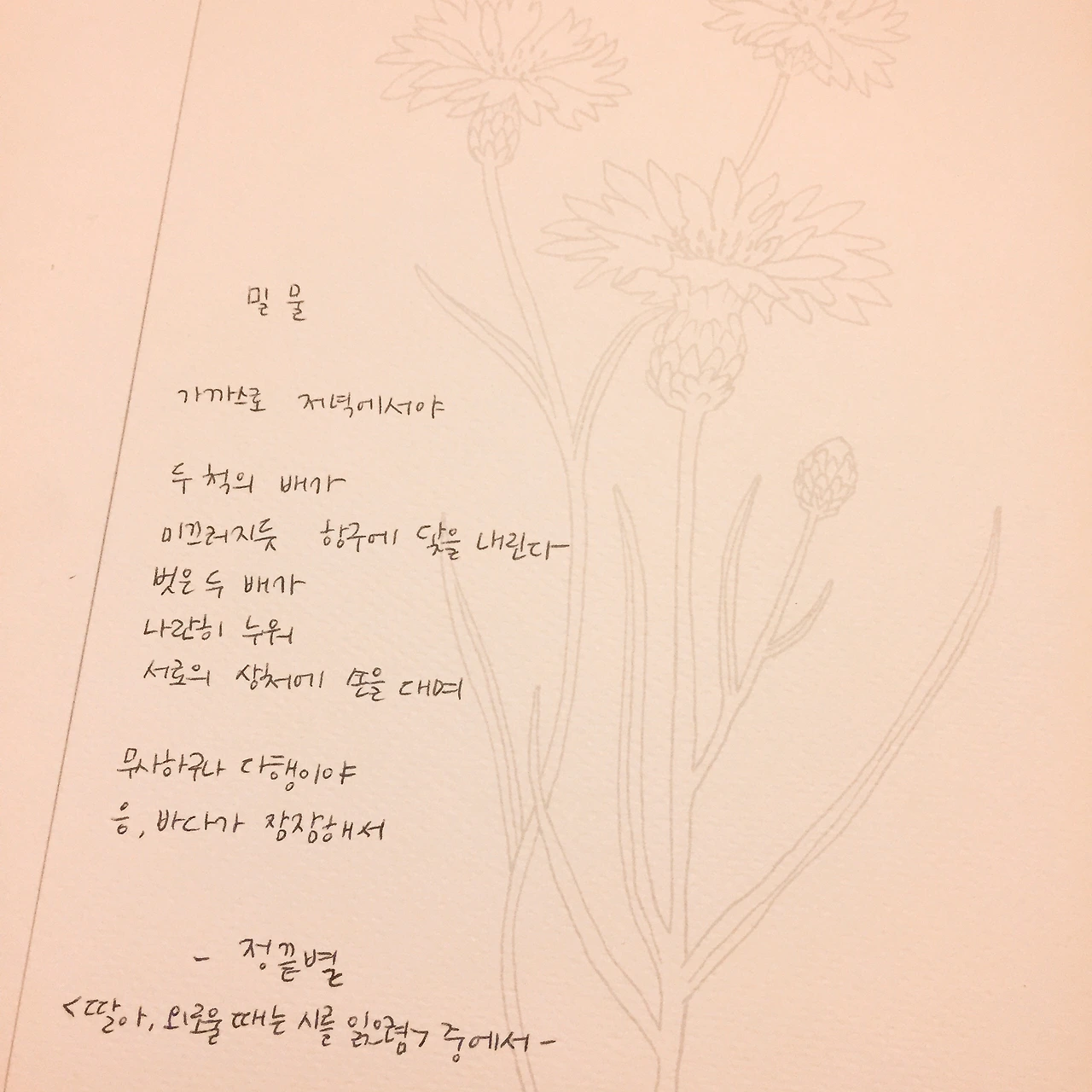 밀물– 정끝별가까스로 저녁에서야두 척의 배가미끄러지듯 항구에 닻을 내린다벗은 두 배가나란히 누워서로의 상처에 손을 대며무사하구나 다행이야응, 바다가 잠잠해서